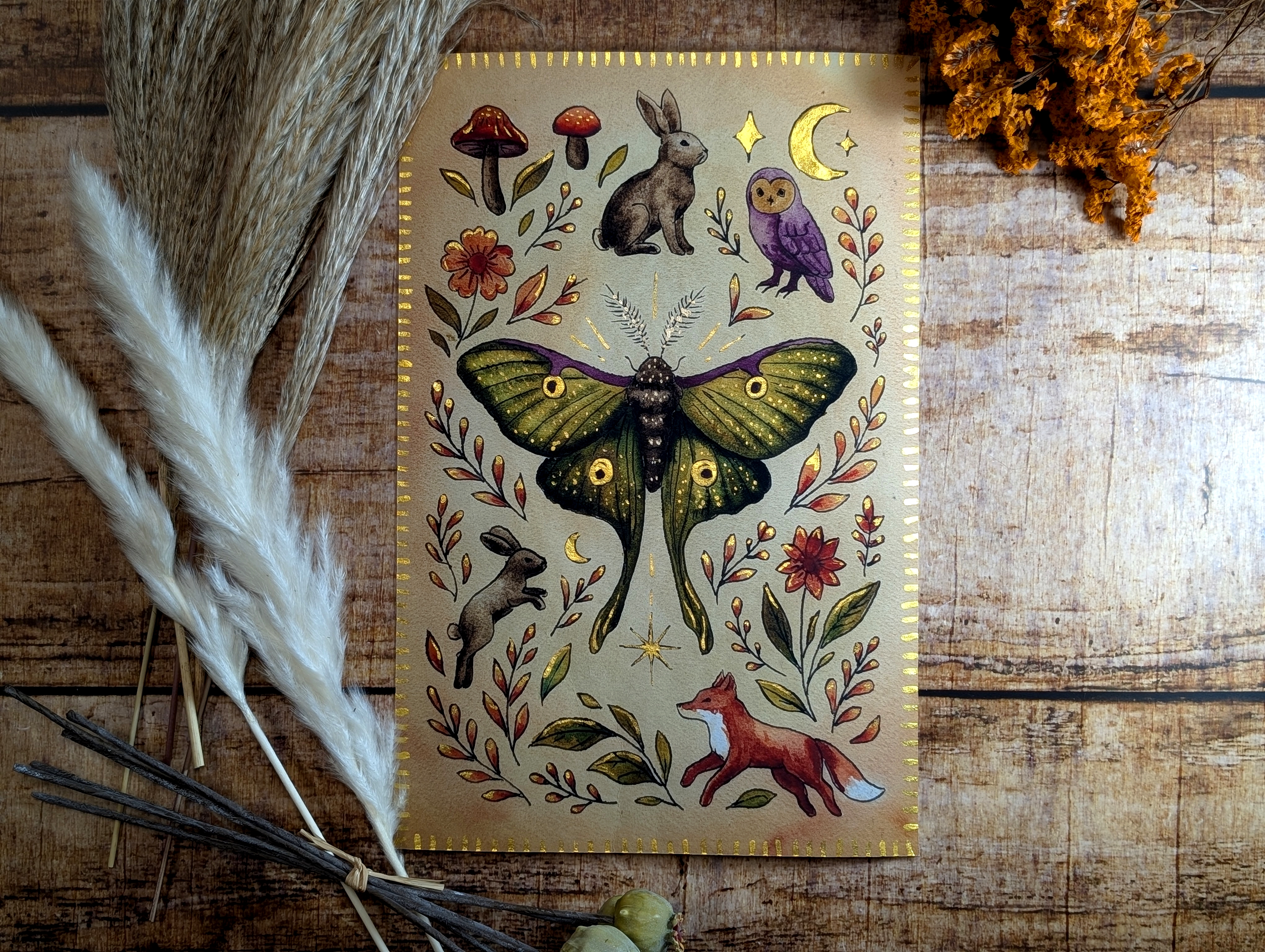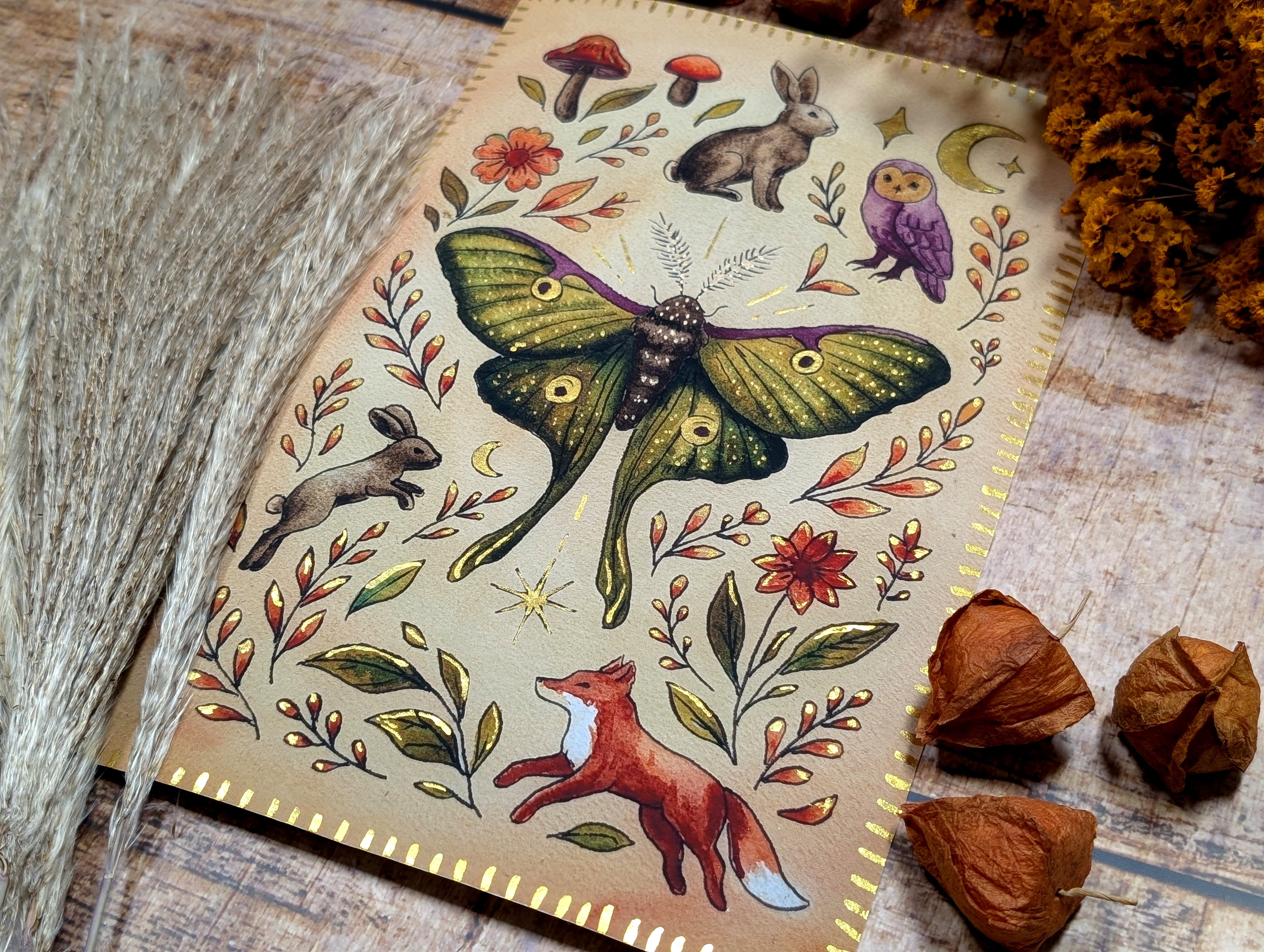 Dieser hochwertige FineArt-Druck basiert auf meinem handgemalten Original, das mit feinsten Künstleraquarellen (Daniel Smith, Schmincke Horadam und handgefertigten Farben von Tiny Watercolors) auf Arches Fine Grain Aquarellpapier entstanden ist. Wenn du die entsprechende Option beim Einkauf wählst, wird jeder einzelne Druck wird von mir in liebevoller Handarbeit mit schimmernden, handgemachten Metallicfarben und Goldfarben von Etchr veredelt – so wird jedes Exemplar zu einem individuellen Kunstwerk mit sanftem Glanz und besonderer Tiefe.