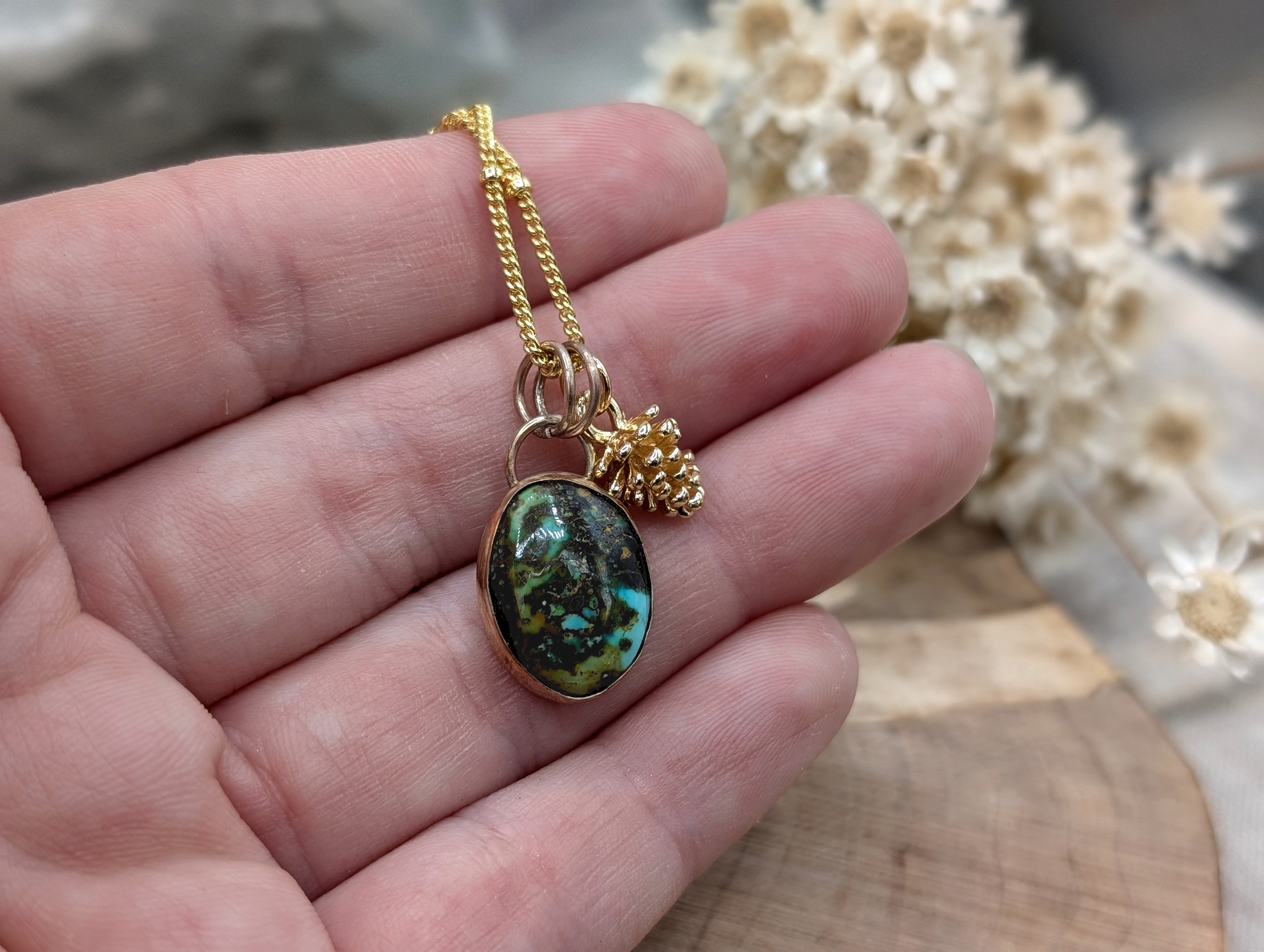 14K Gold Filled Anhänger mit Türkis. Der Tannenzapfen-Anhänger und die Kette sind 18K Gold Filled.