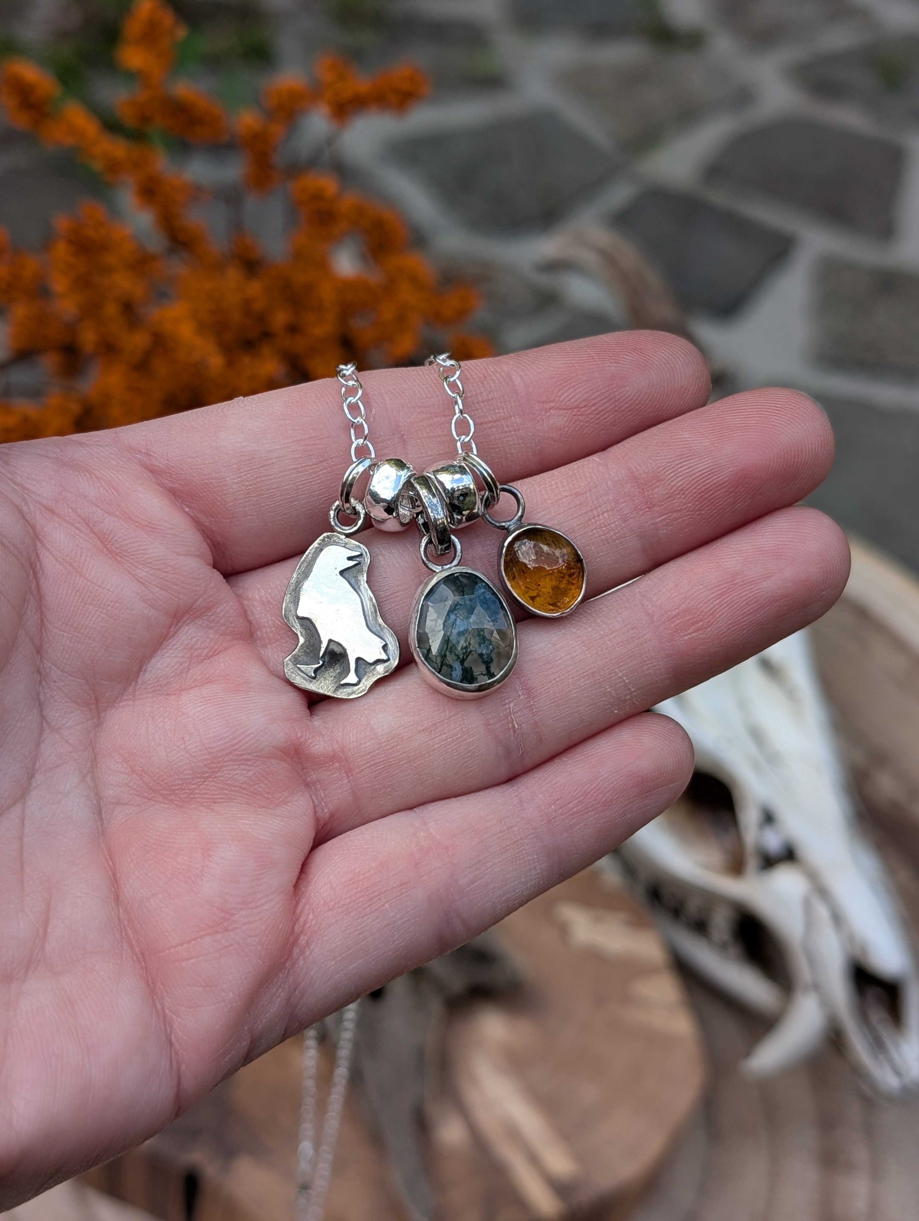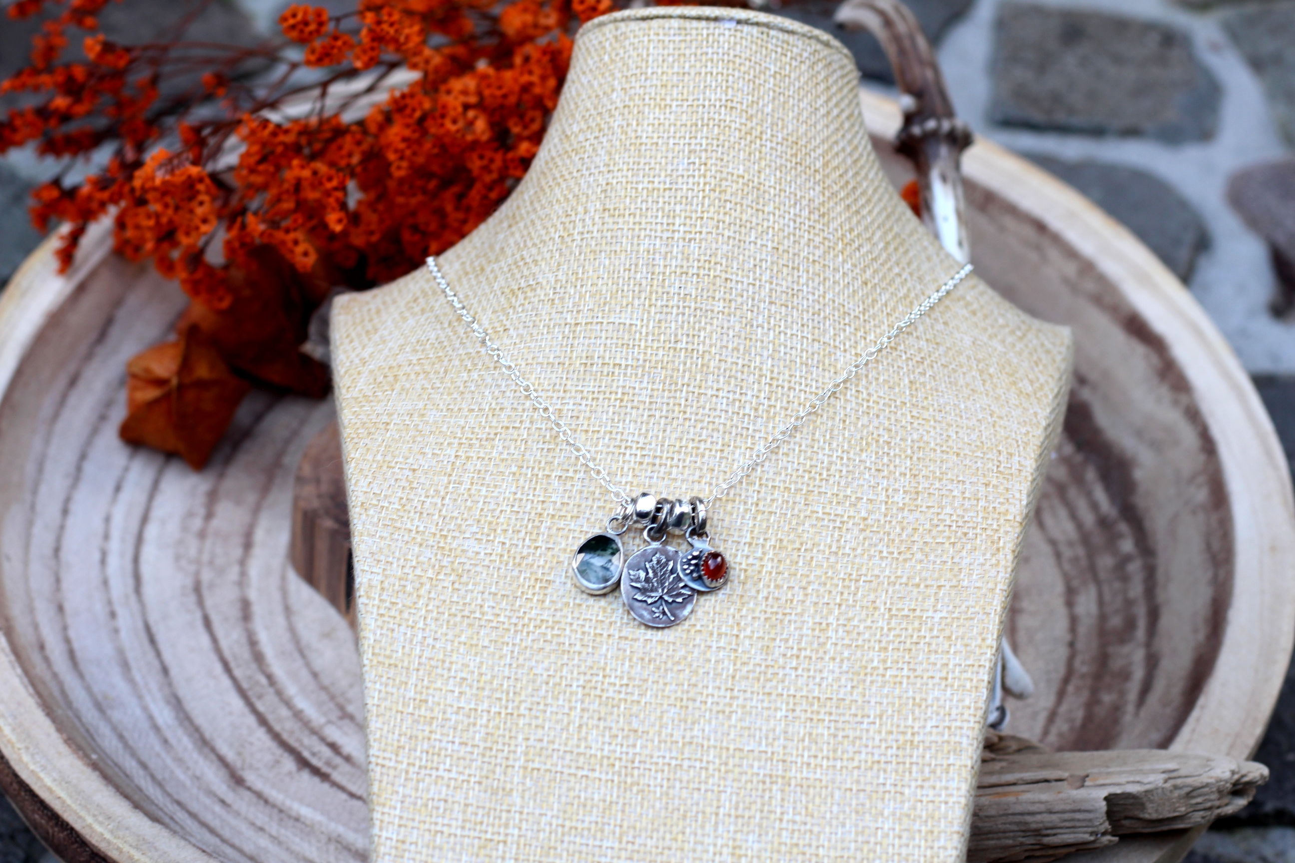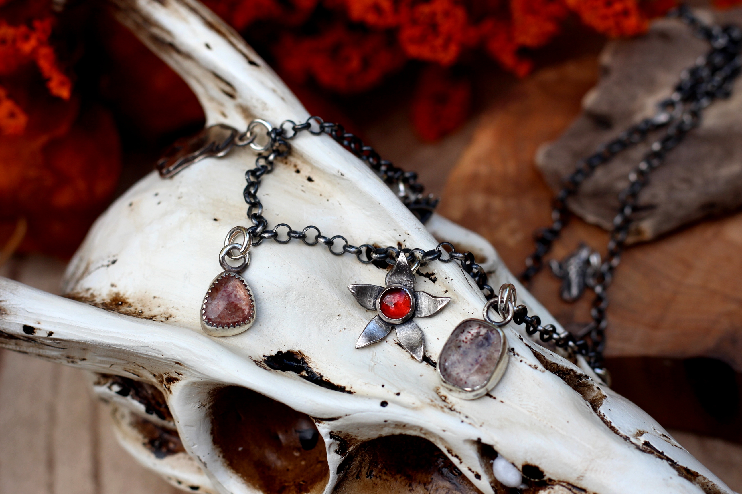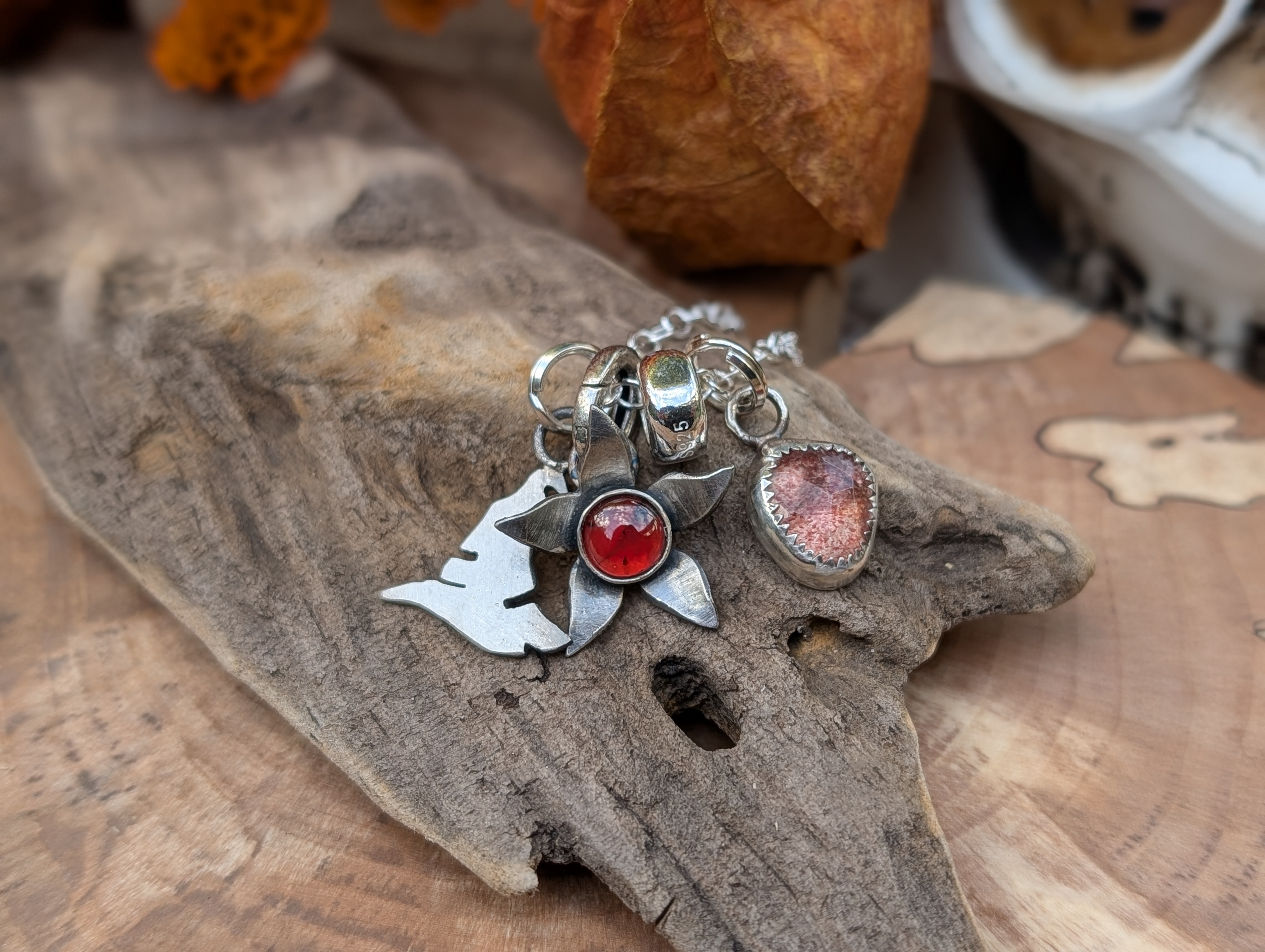 Drei Charms aus 925er Sterlingsilber mit Granat und Erdbeerquarz.