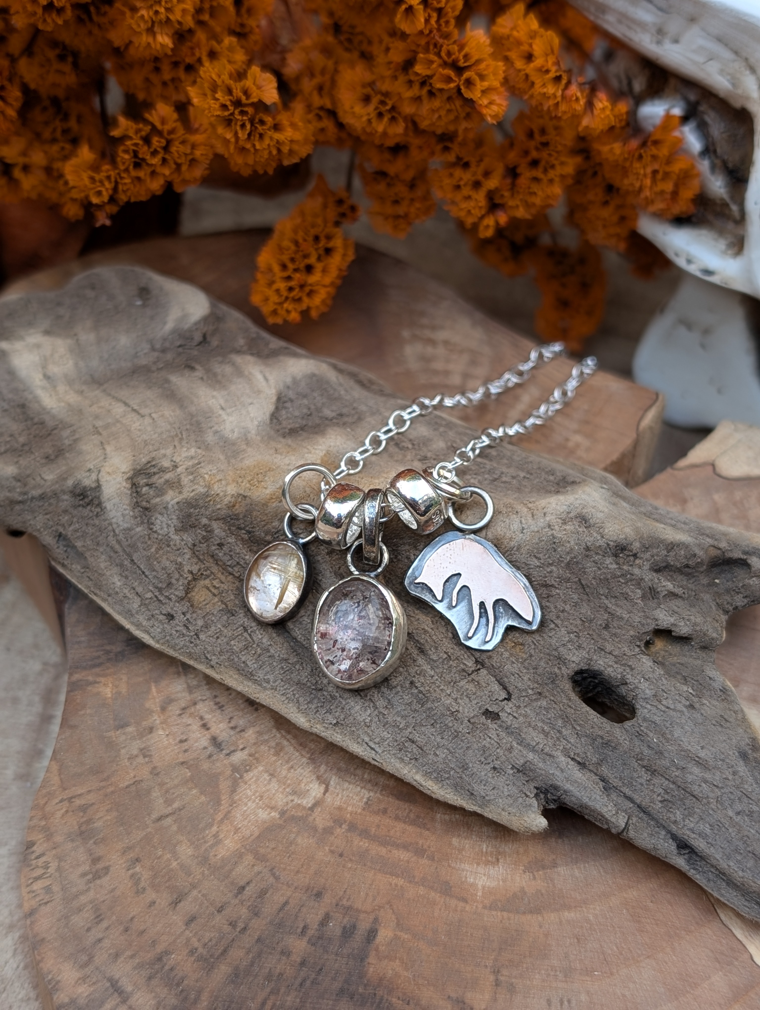 Drei Charms aus 925er Sterlingsilber und Bronze mit Super Seven und goldenem Rutilquarz.