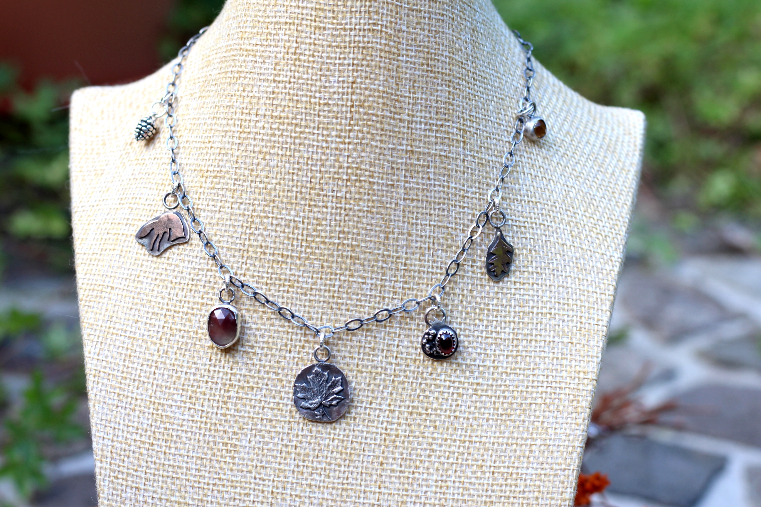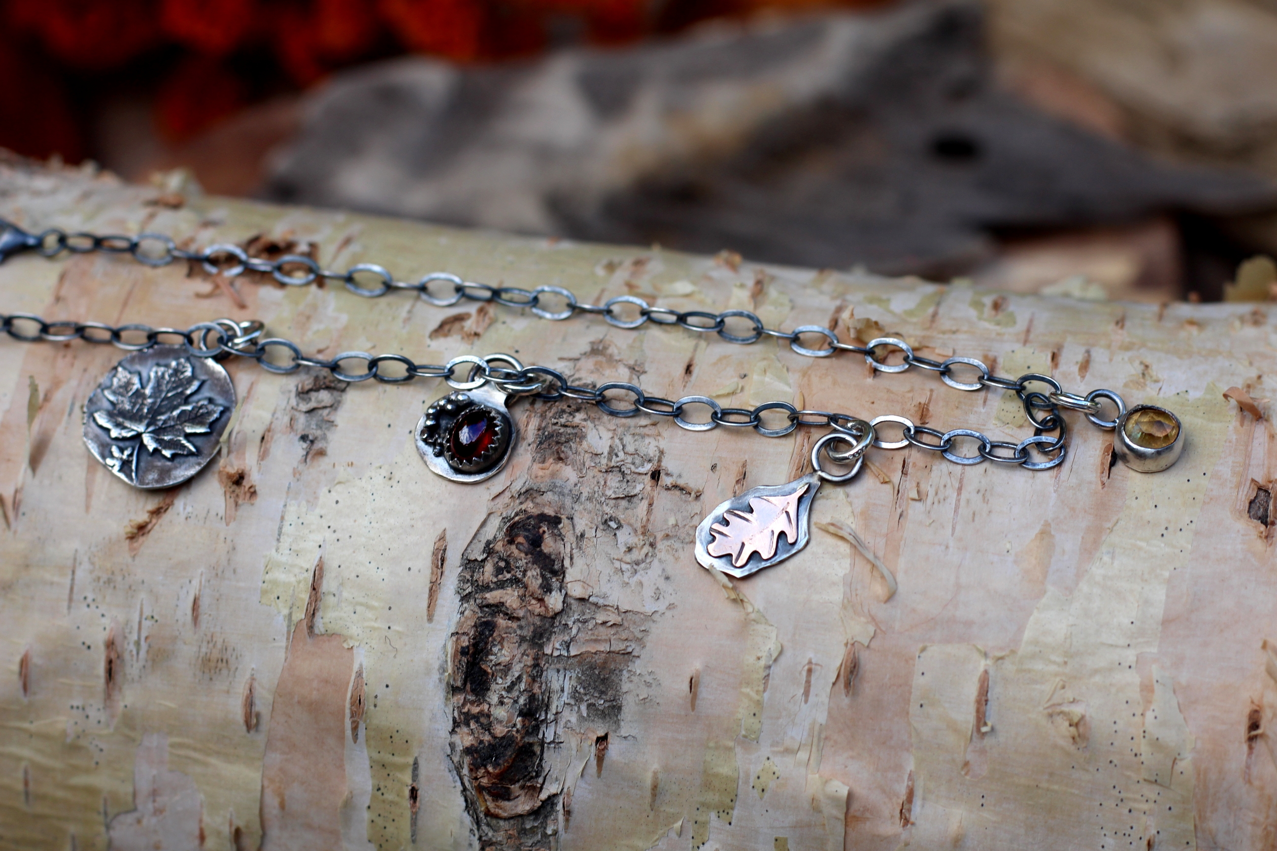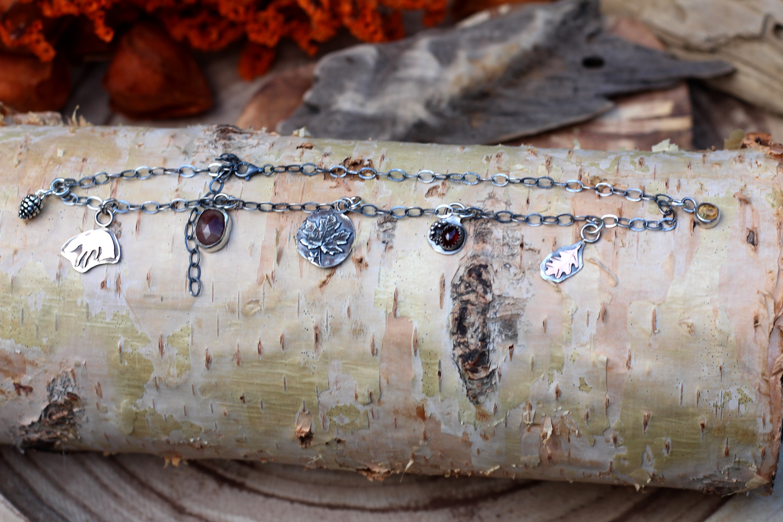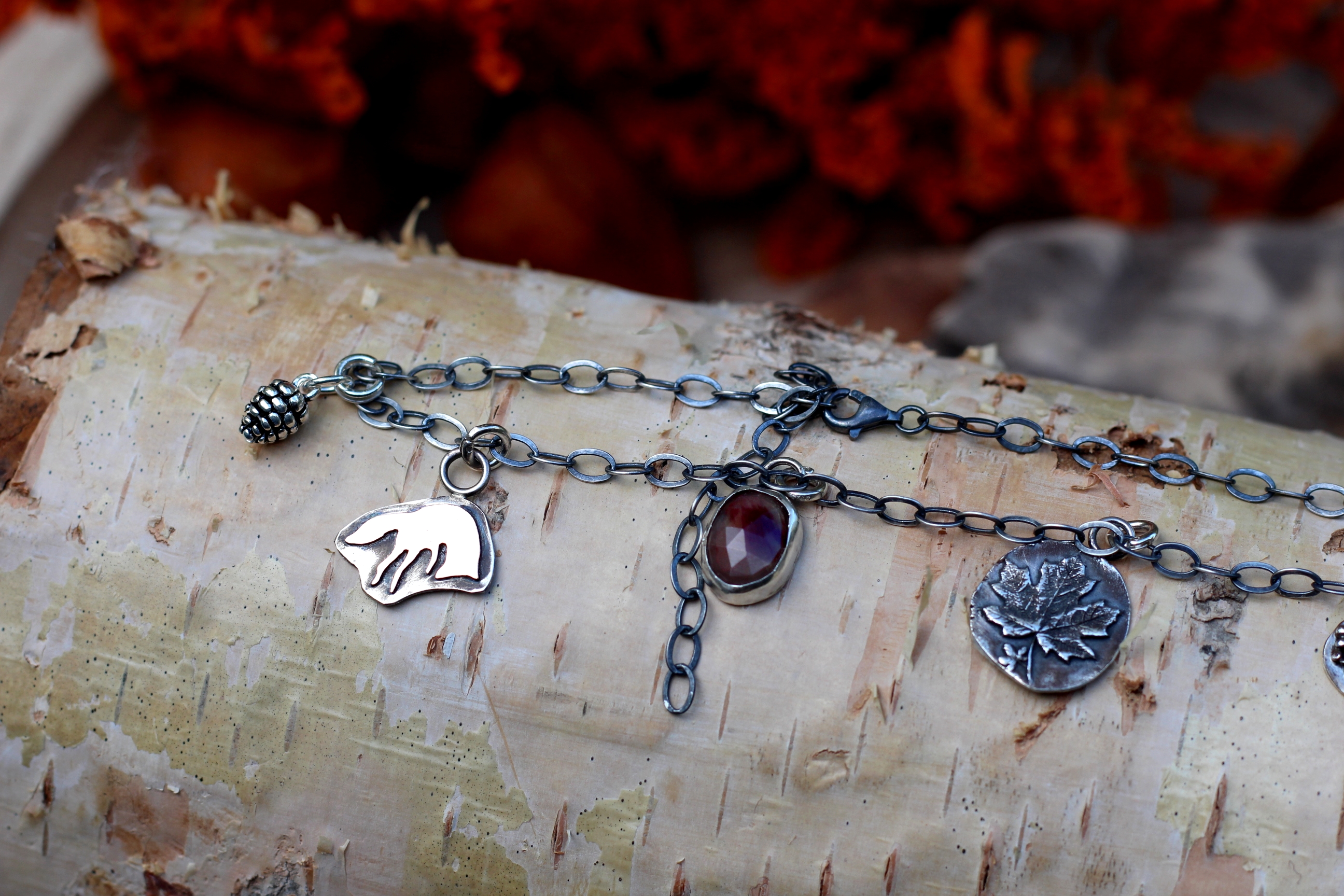 Eine Charmkette aus 925er Sterlingsilber mit 7 verschiedenen handgeschmiedeten Charms - von links nach rechts: