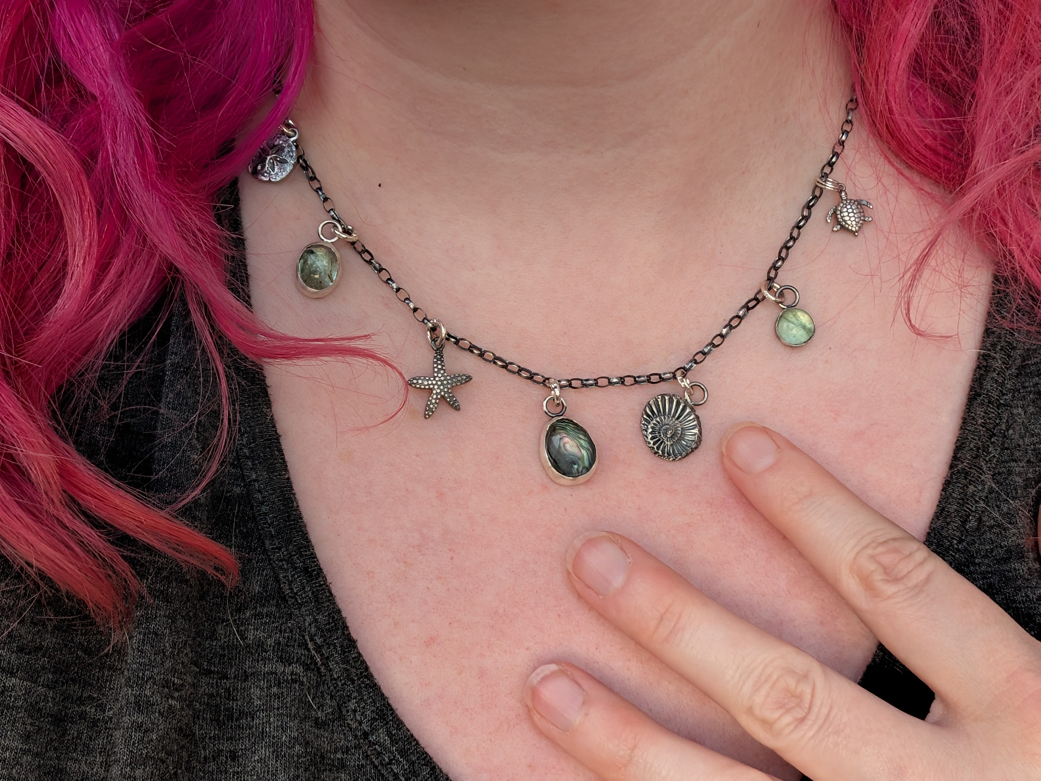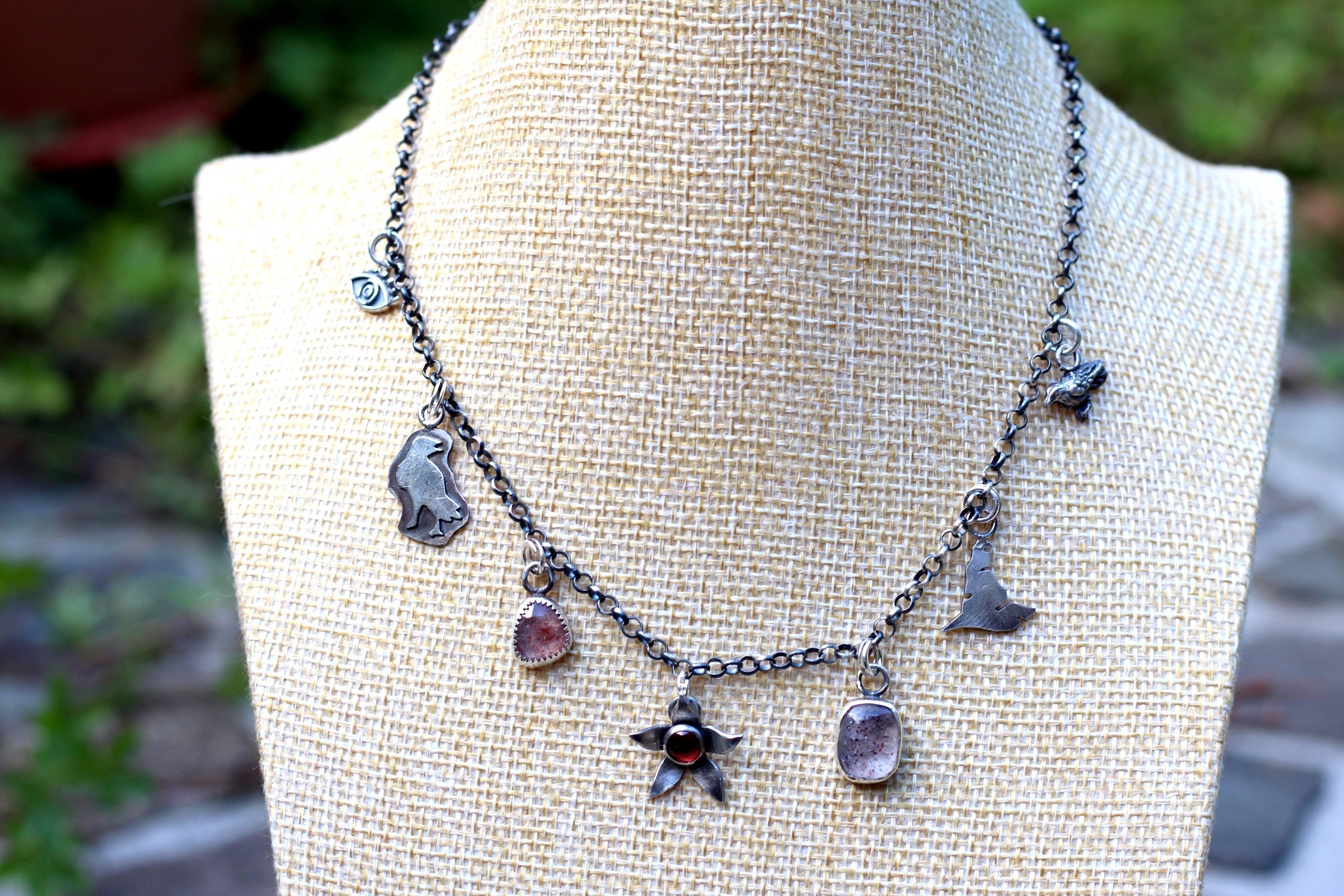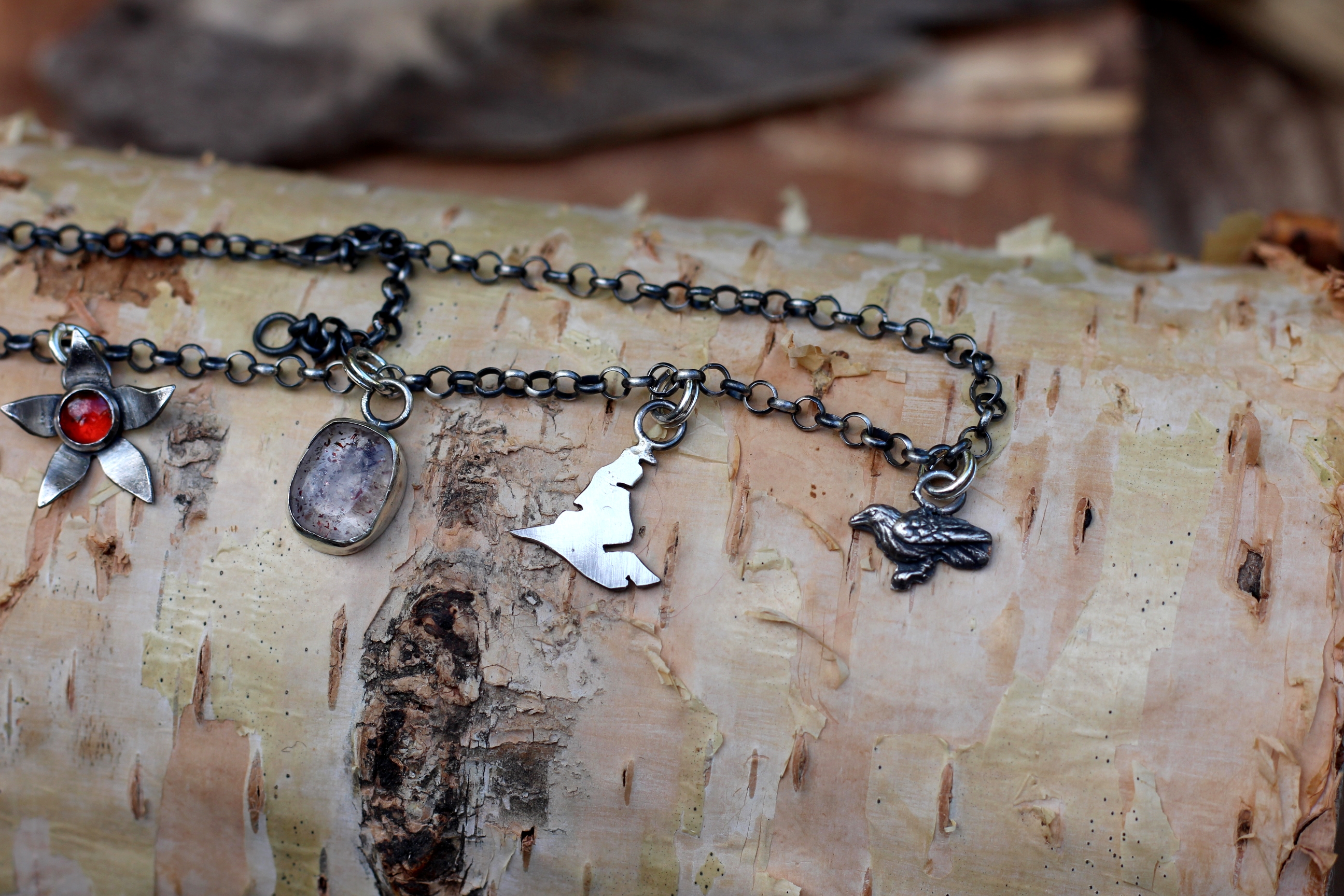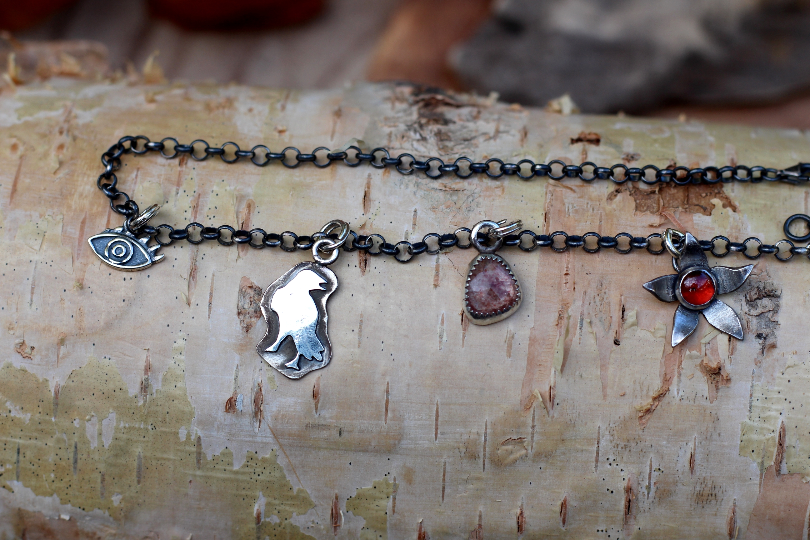 Eine Charmkette aus 925er Sterlingsilber mit 7 verschiedenen handgeschmiedeten Charms - von links nach rechts: