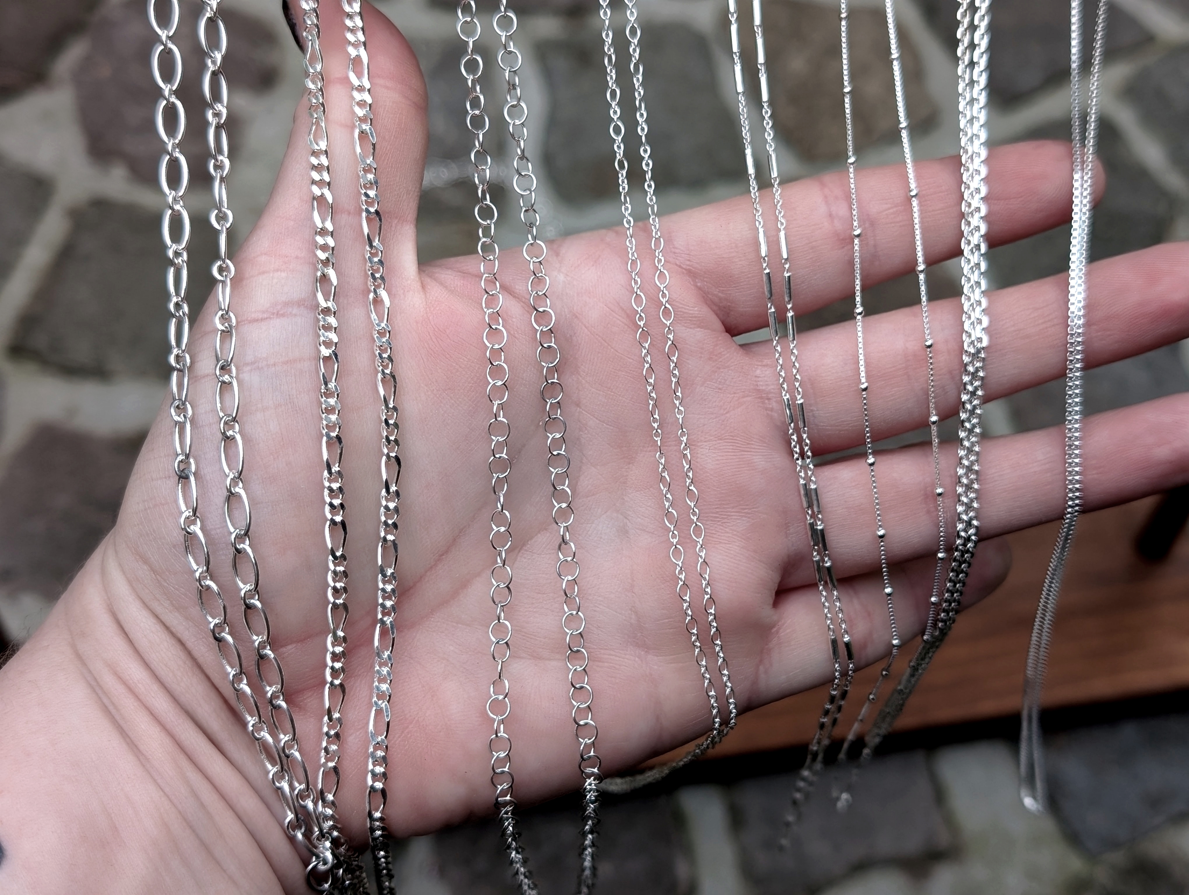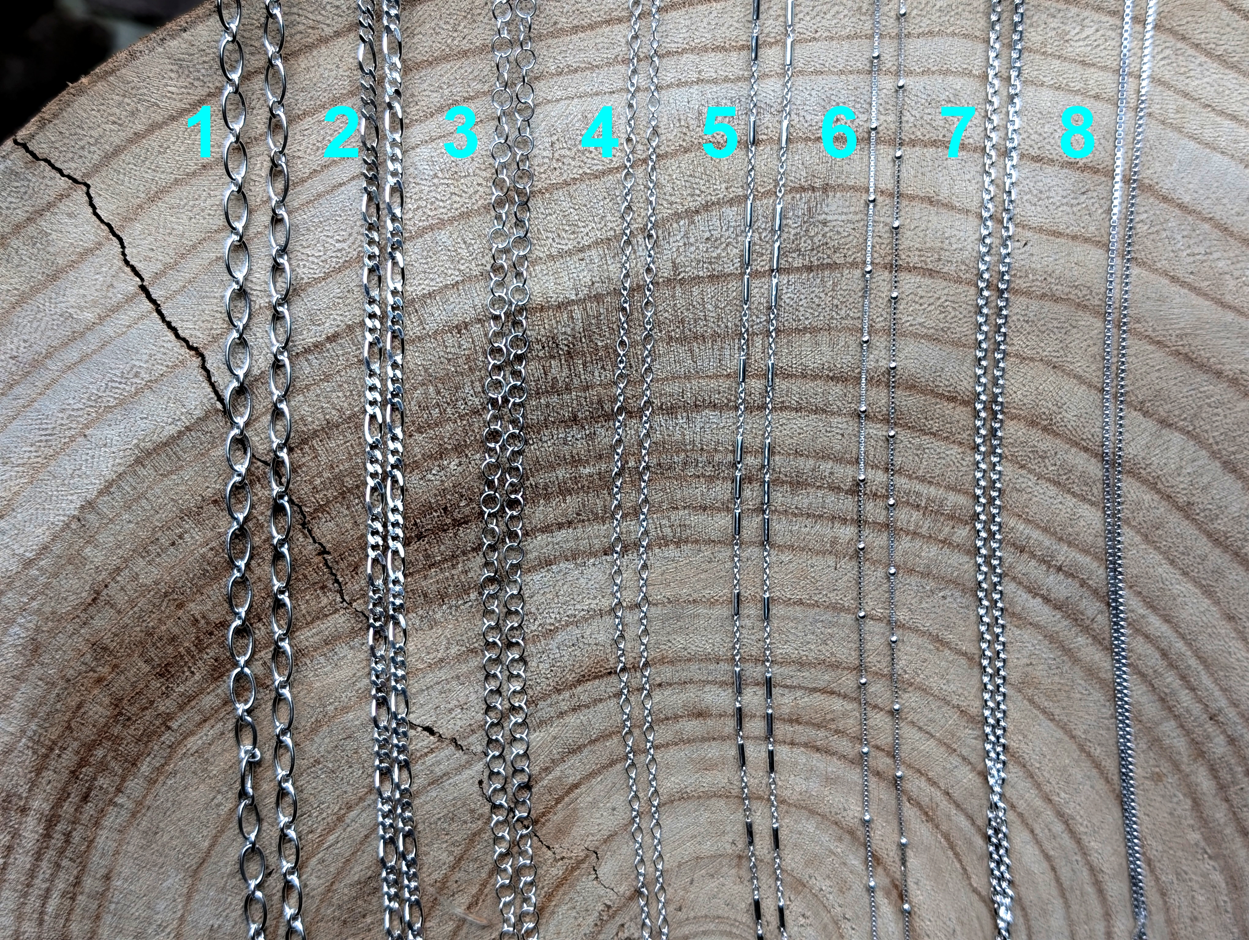 925er Sterlingsilber mit von mir angelötetem Karabinerverschluss. Alle lassen sich auf 45 oder 50 cm einstellen.