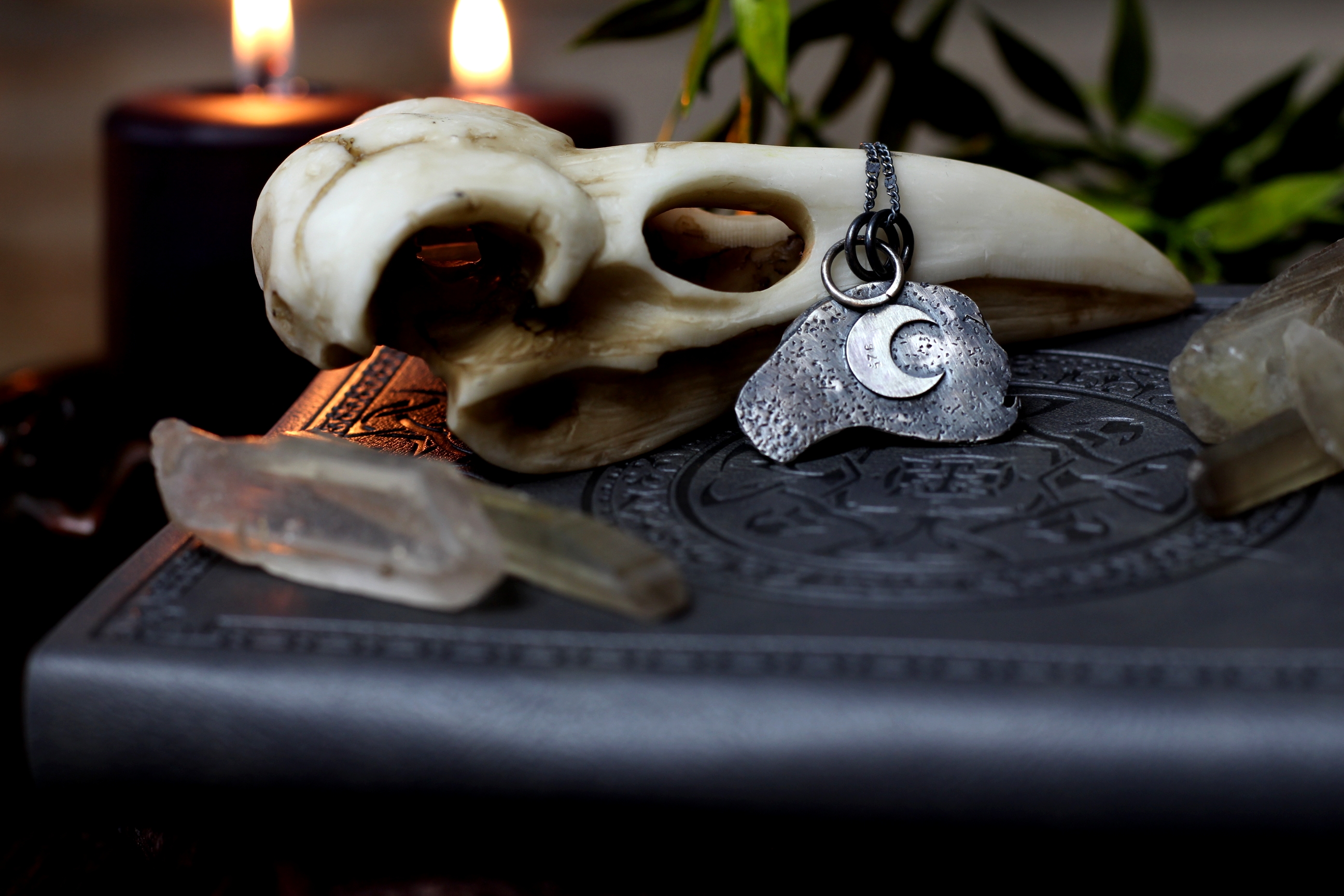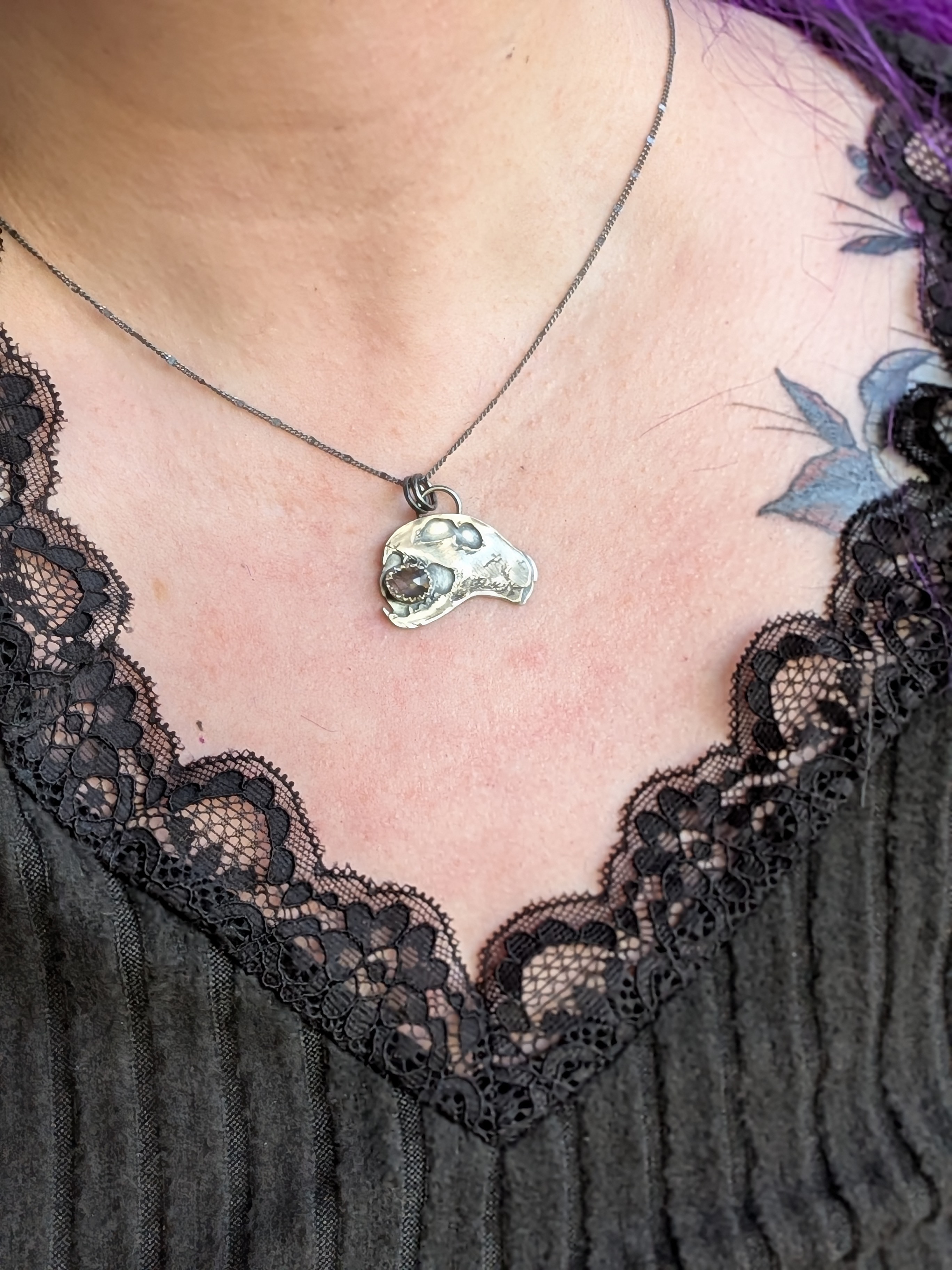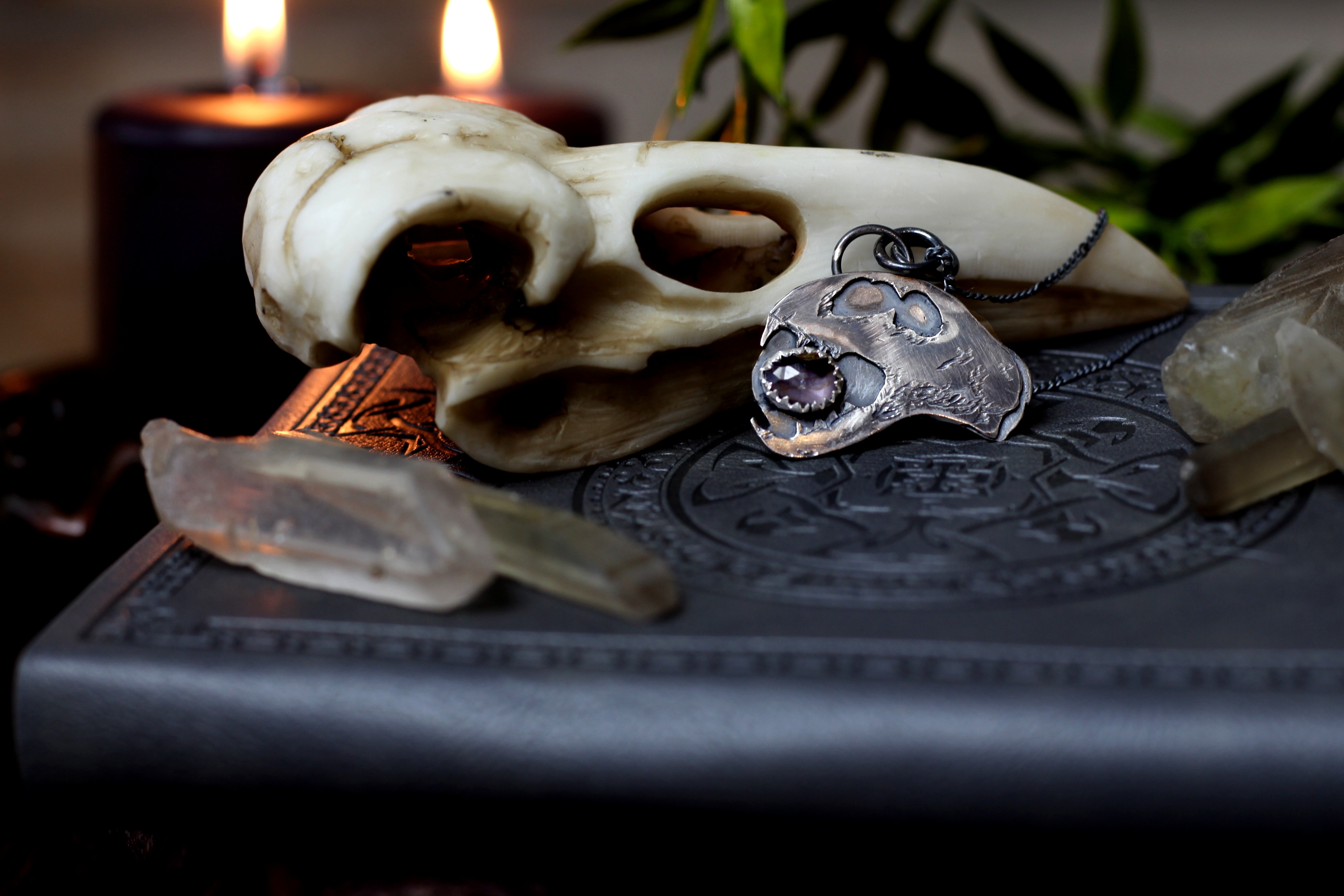 Ein Katzenschädel aus 925er Sterlingsilber mit lavendelfarbenem Spinell.