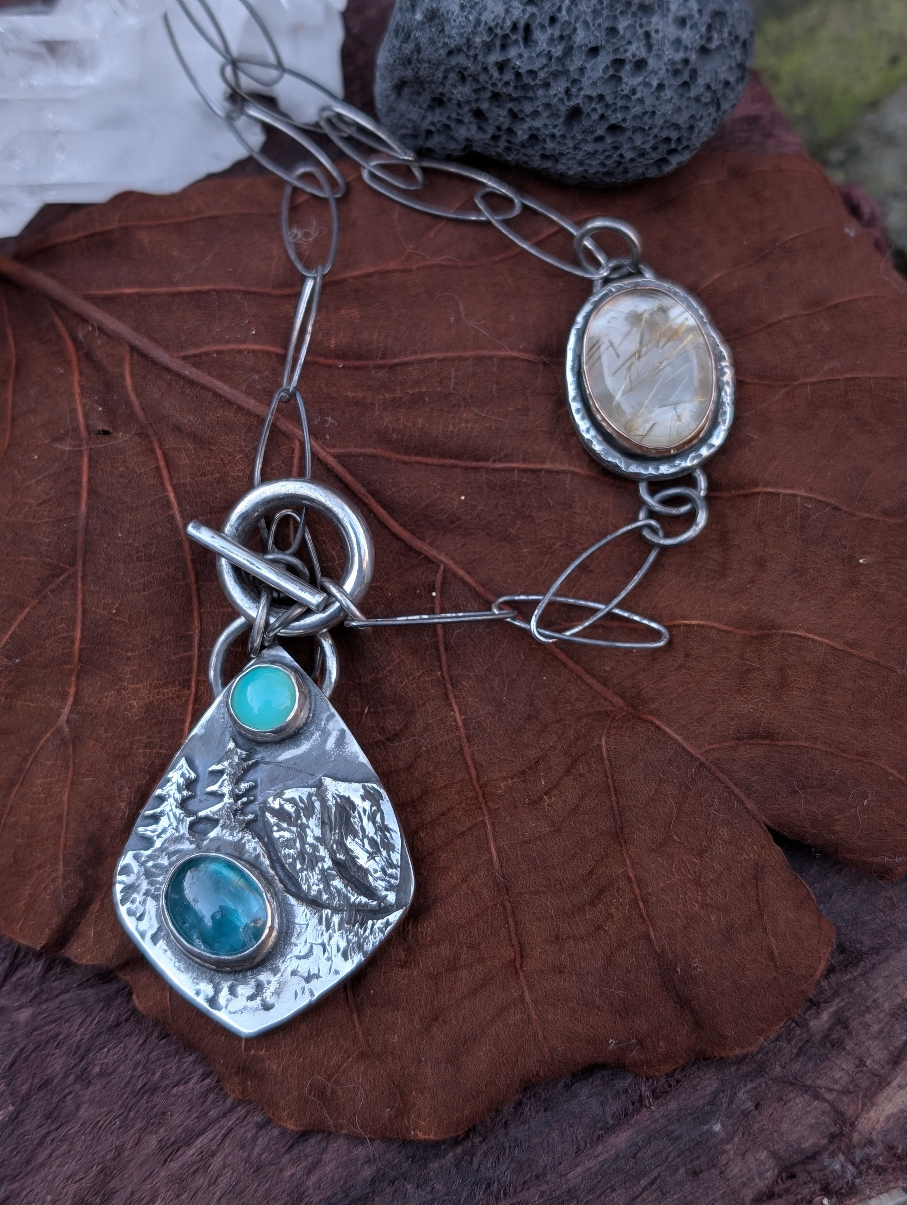 Halskette aus Sterlingsilber mit Uranglas, Kyanit und goldenem Rutilquarz