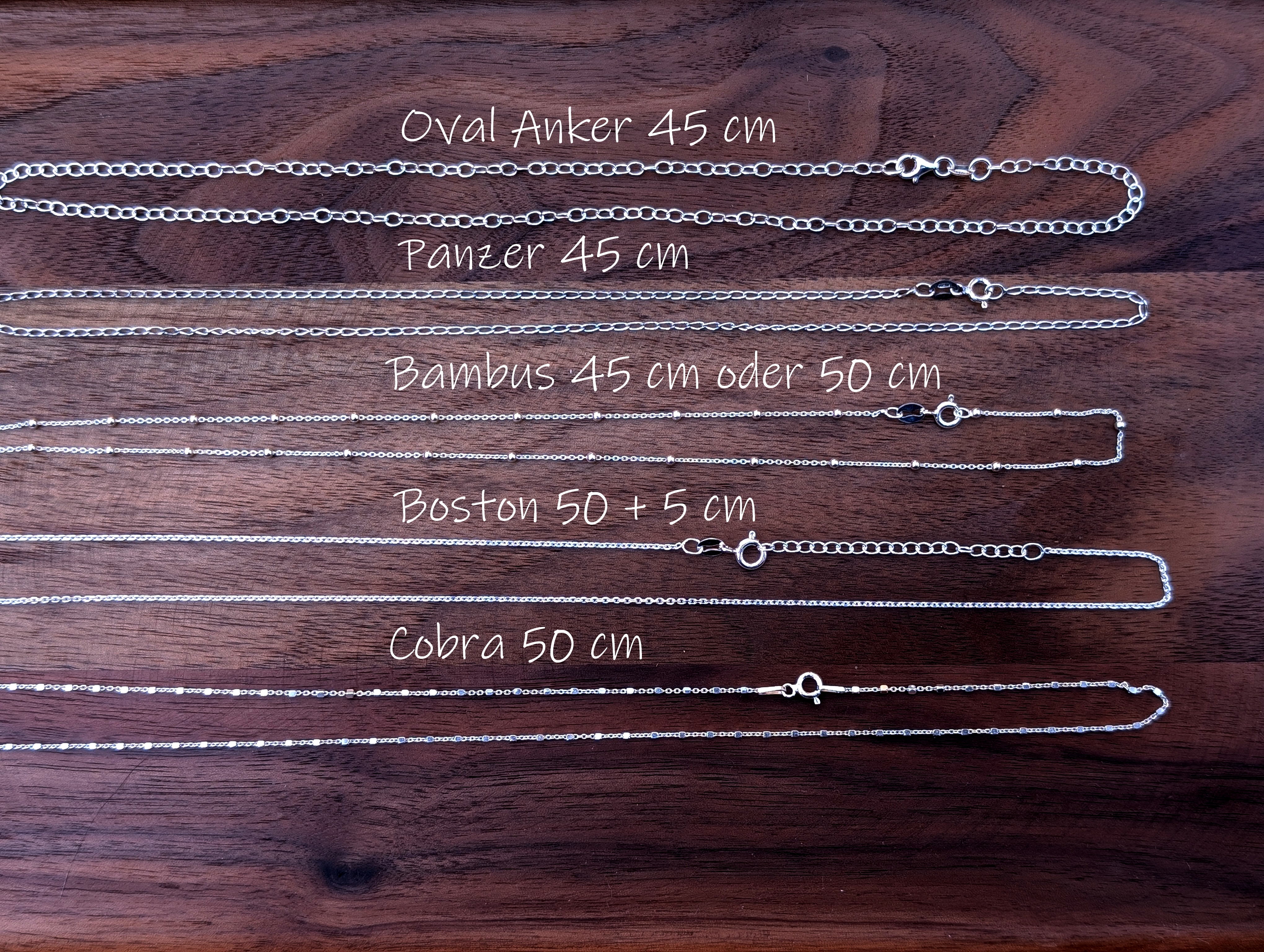 Wenn du keinen anderen Wunsch äußerst, kommt der Anhänger an einer Bambus-Kette aus Sterlingsilber mit 50 cm Länge. Auf dem letzten Bild siehst du aber auch ein paar Alternativen, falls du andere Kettenglieder oder eine andere Länge bevorzugst.