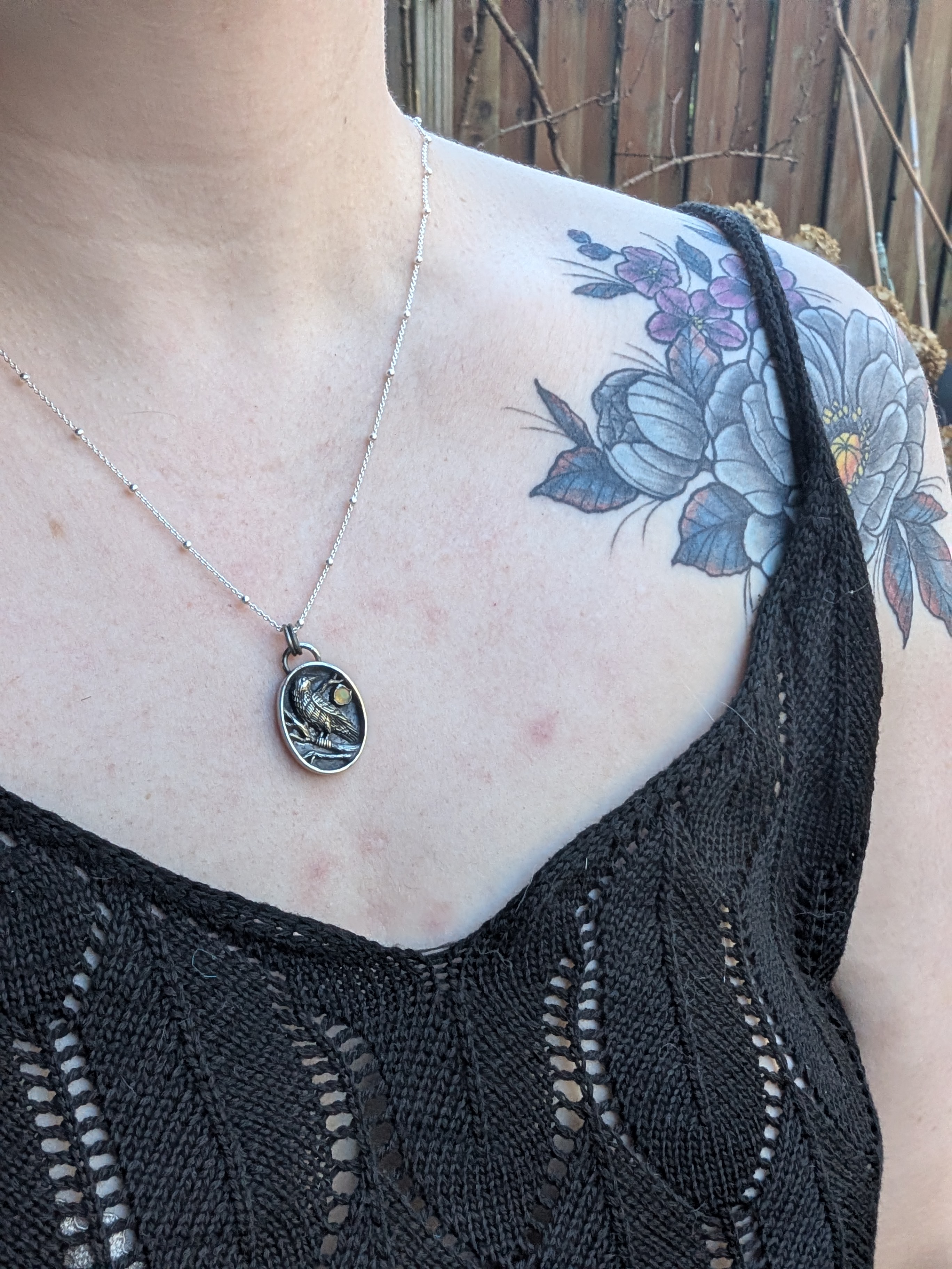 Wenn du keinen anderen Wunsch äußerst, kommt der Anhänger an einer Bambus-Kette aus Sterlingsilber mit 50 cm Länge. Auf dem letzten Bild siehst du aber auch ein paar Alternativen, falls du andere Kettenglieder oder eine andere Länge bevorzugst.