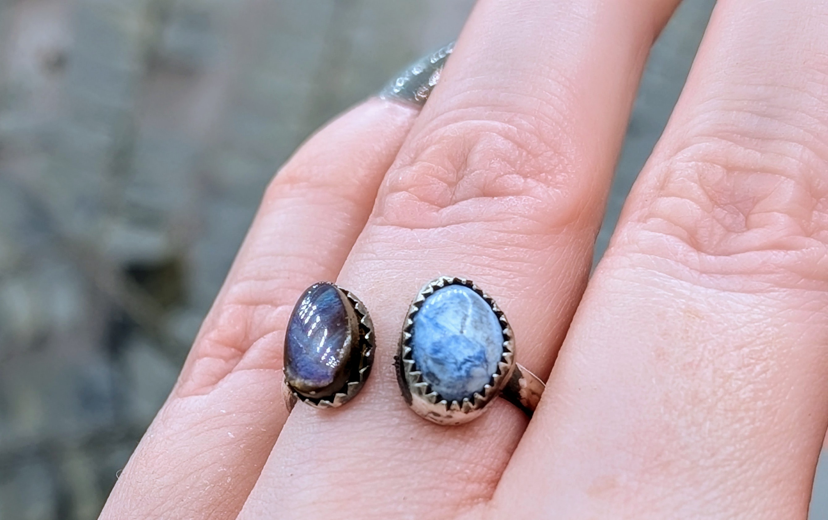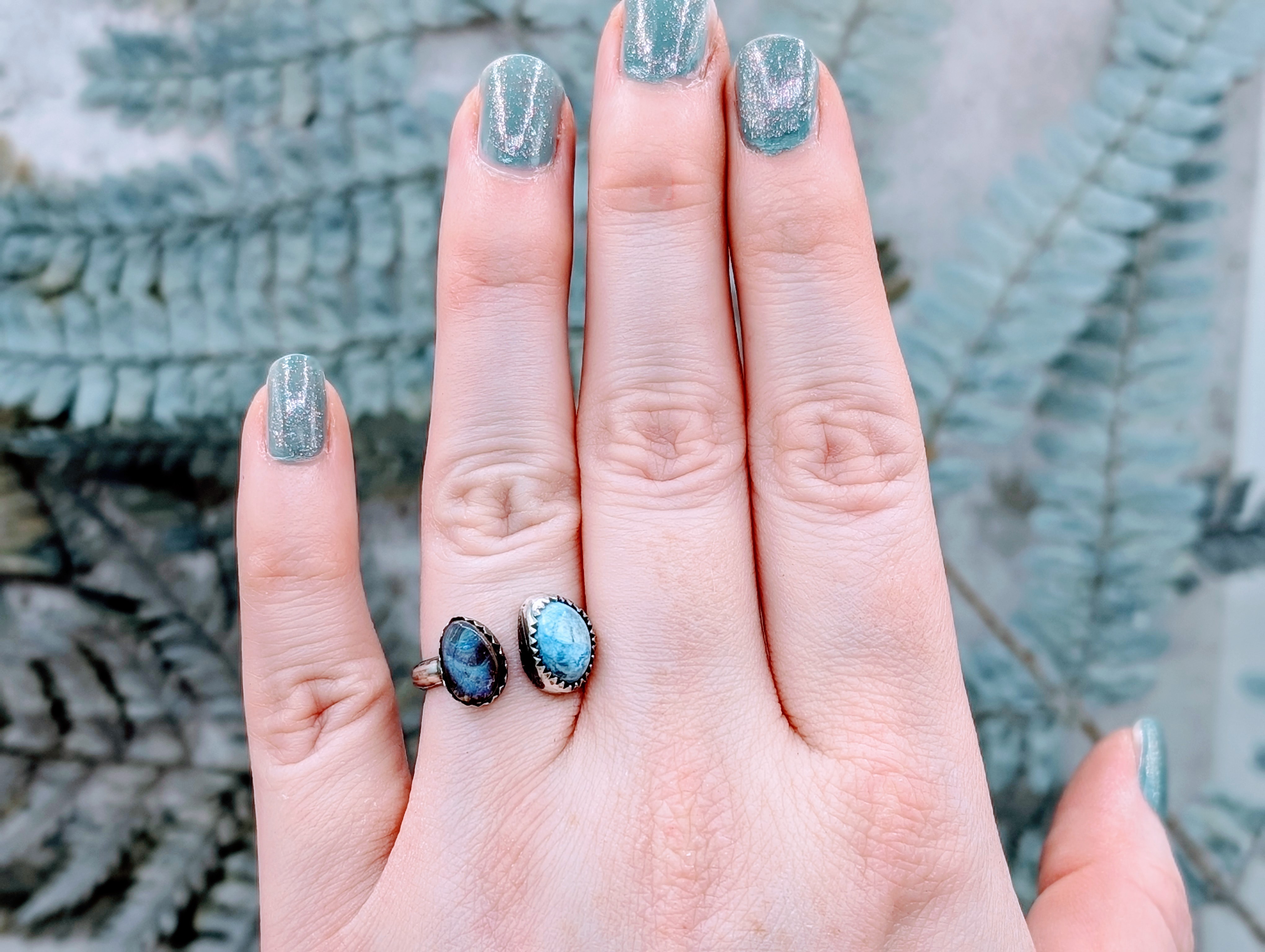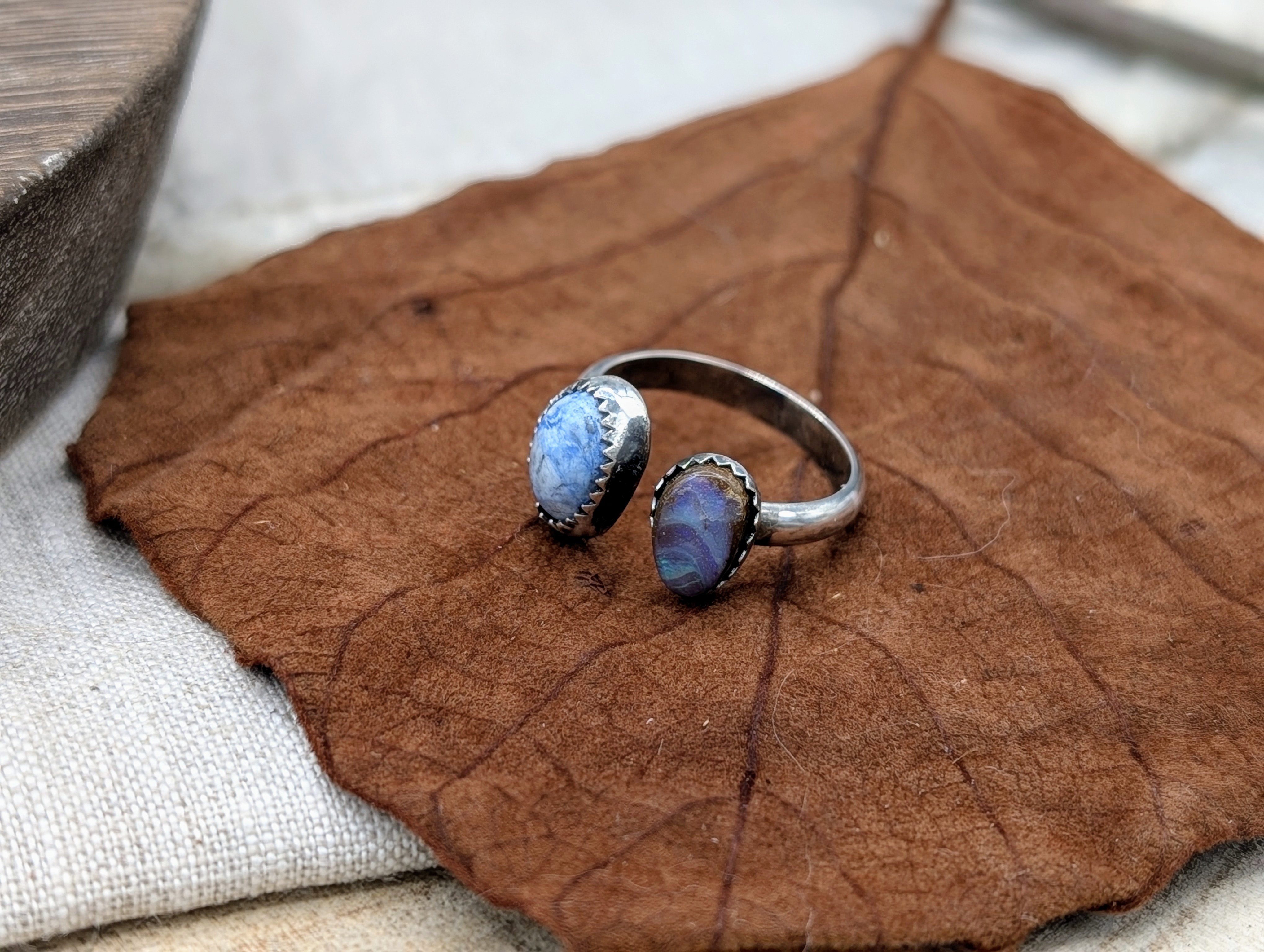 925er Sterlingsilber, australischer Opal und seltener, wertvoller Lavender Hills Türkis aus Arizona. Die Steine sind ethisch in Australien und den USA bezogen.