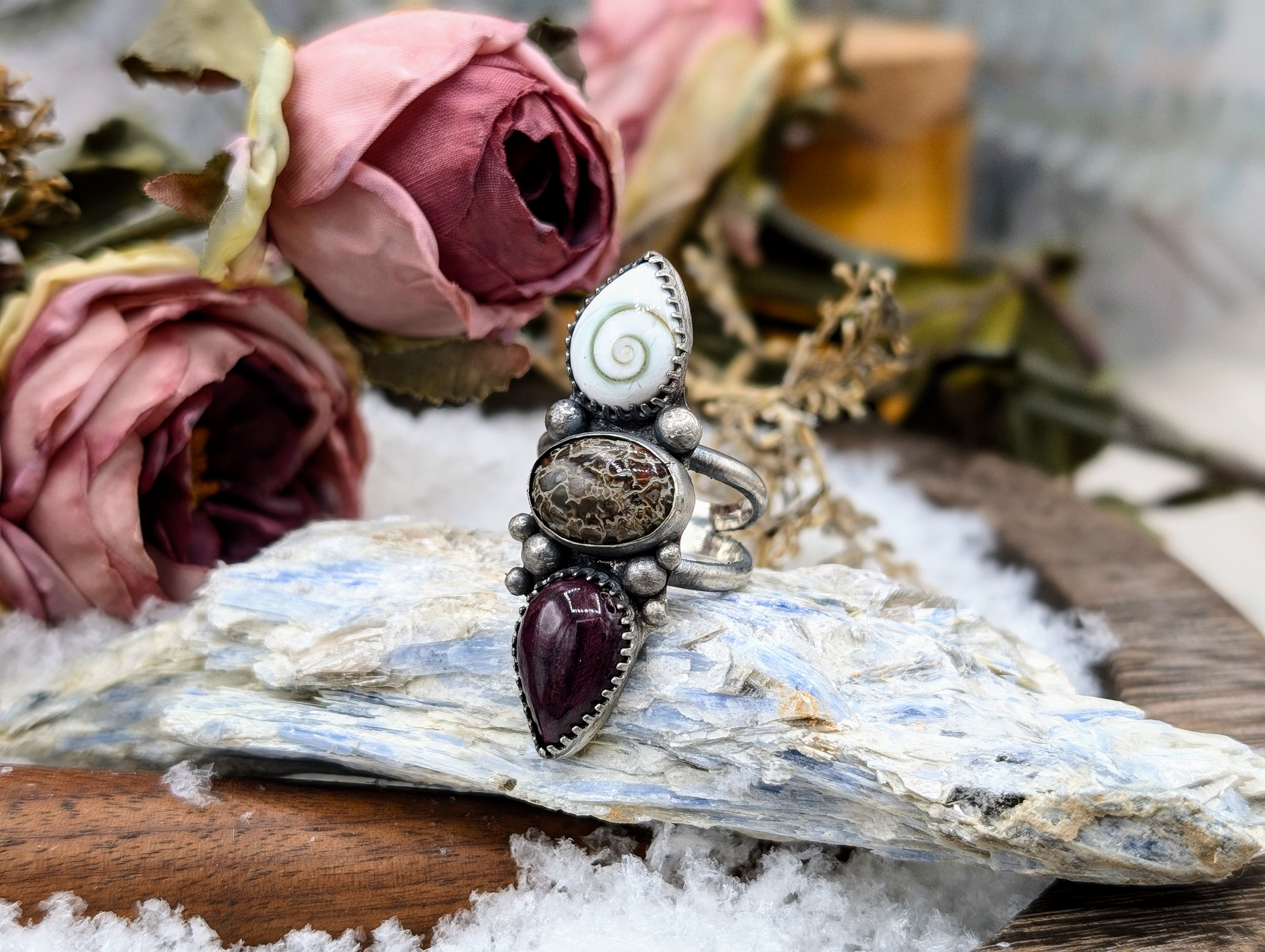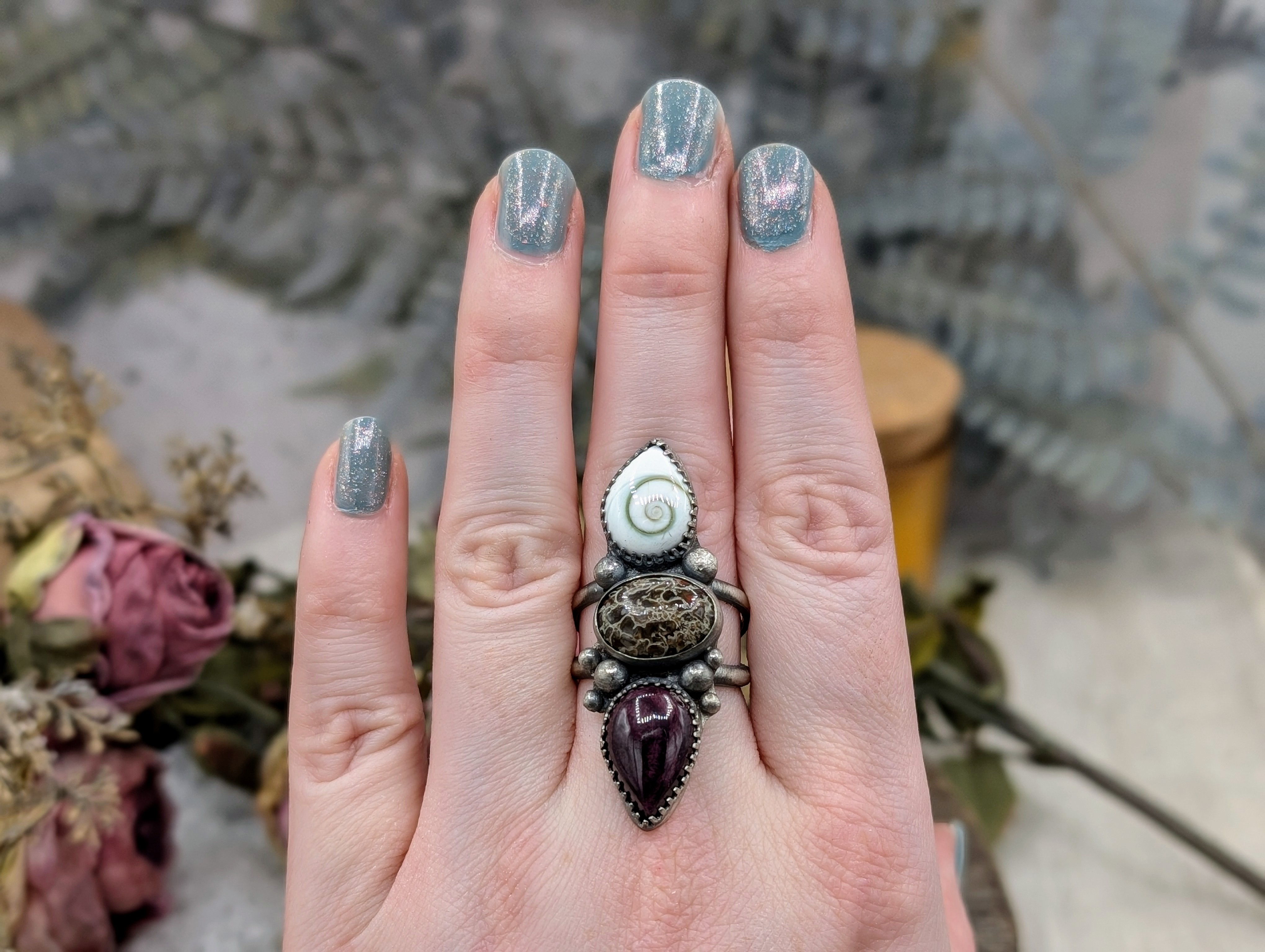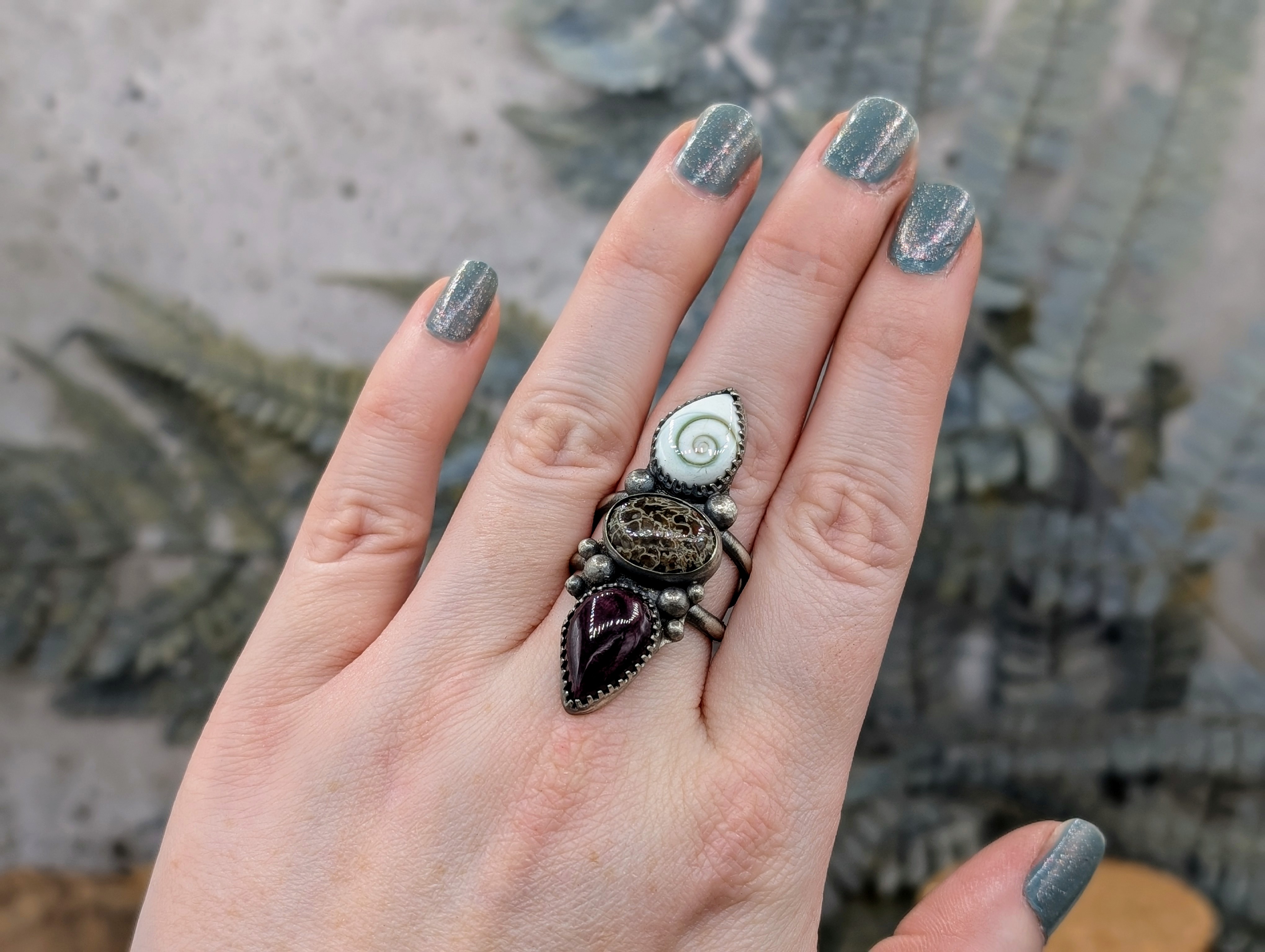 Statement Ring Gr. 56 mit Shiva Muschel, Dino Bone und Spiney Oyster Shell