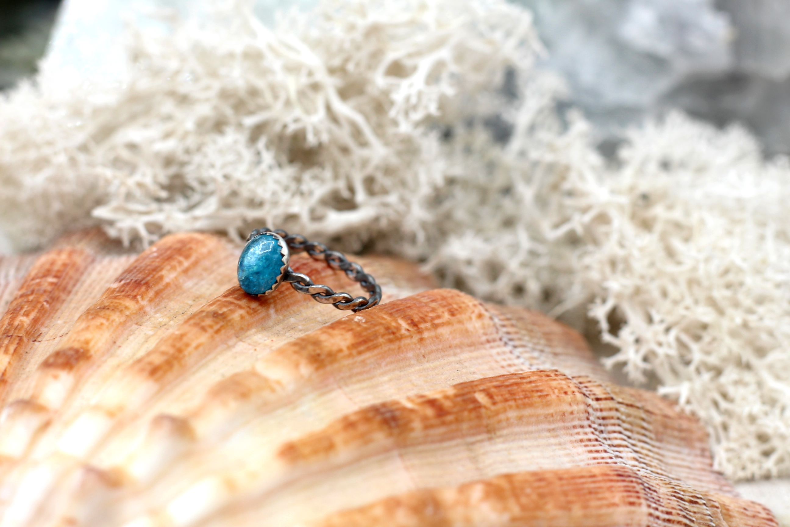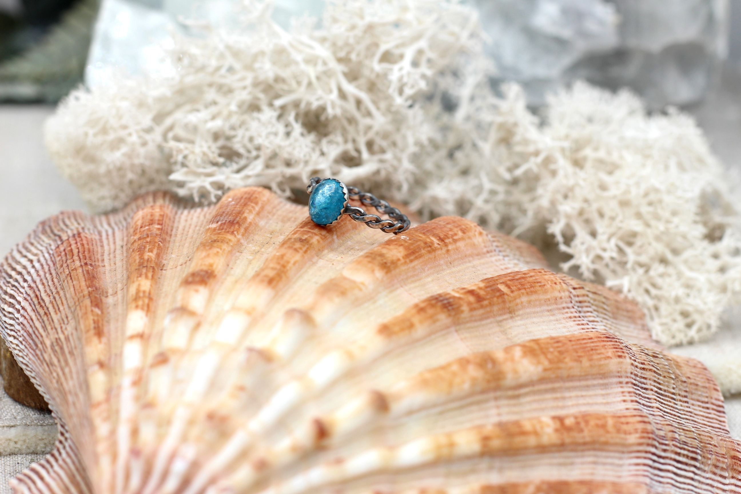 Ring aus 925er Sterlingsilber mit natürlichem Apatit, geschliffen von Selma aus Pakistan (Karim Gems). Die Ringschiene hat ein wunderschönes Wellen- oder Zopfmuster und ist von Hand geformt.