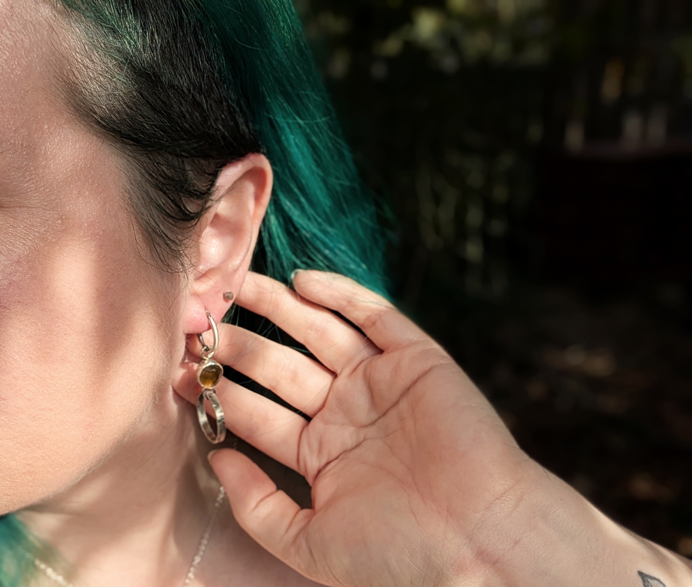Die Ohrringe sind insgesamt ca. 4,5 cm lang. Man kann die Anhänger von den Kreolen abnehmen und durch etwas anderes tauschen.
