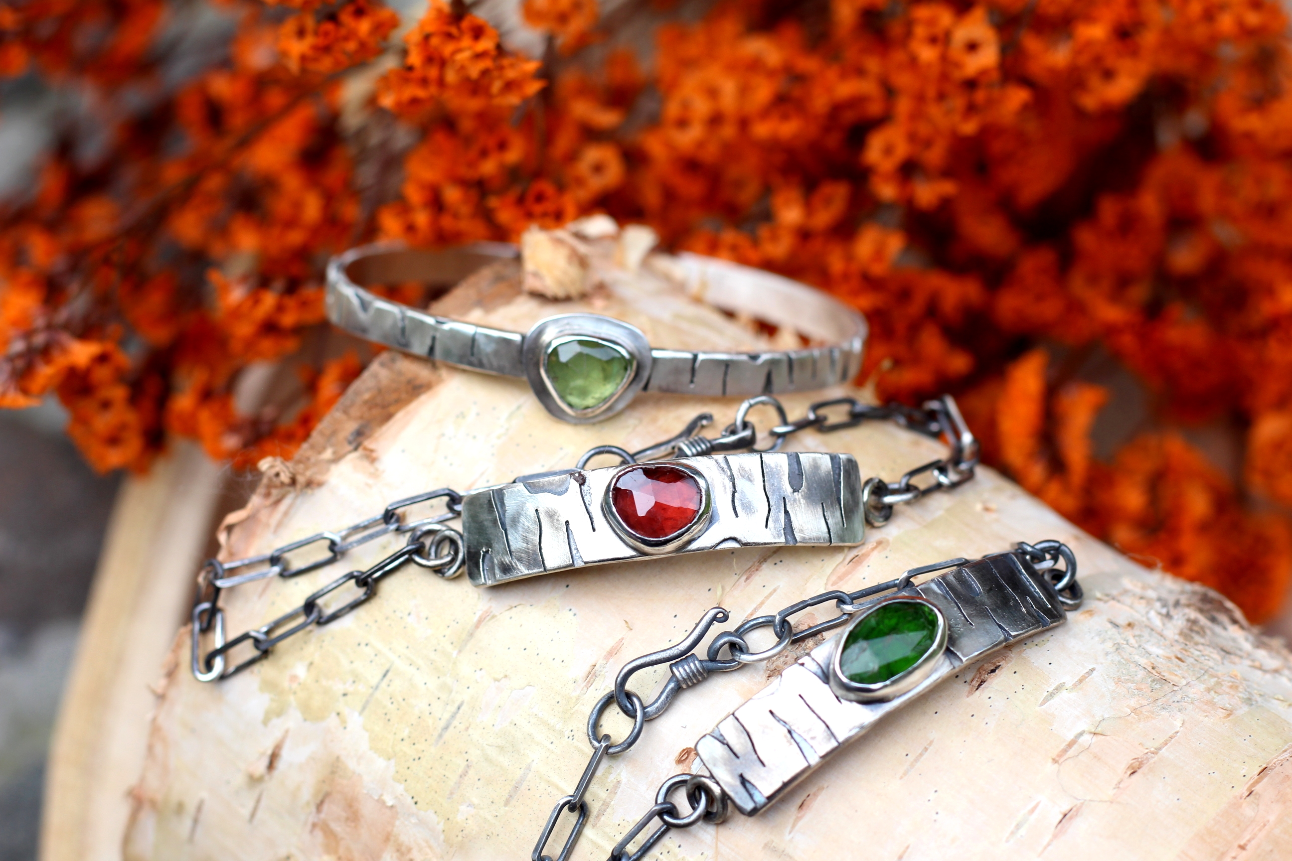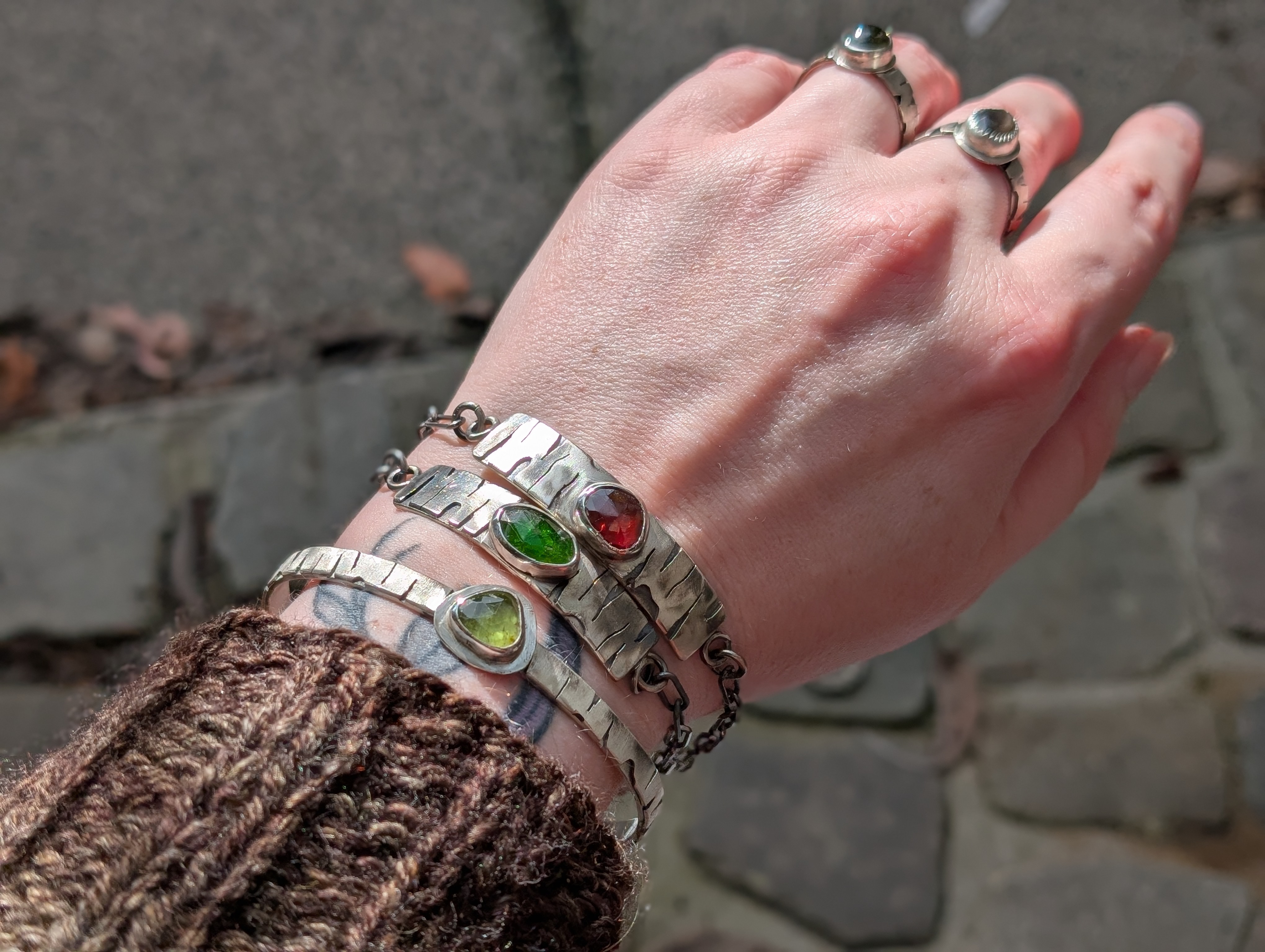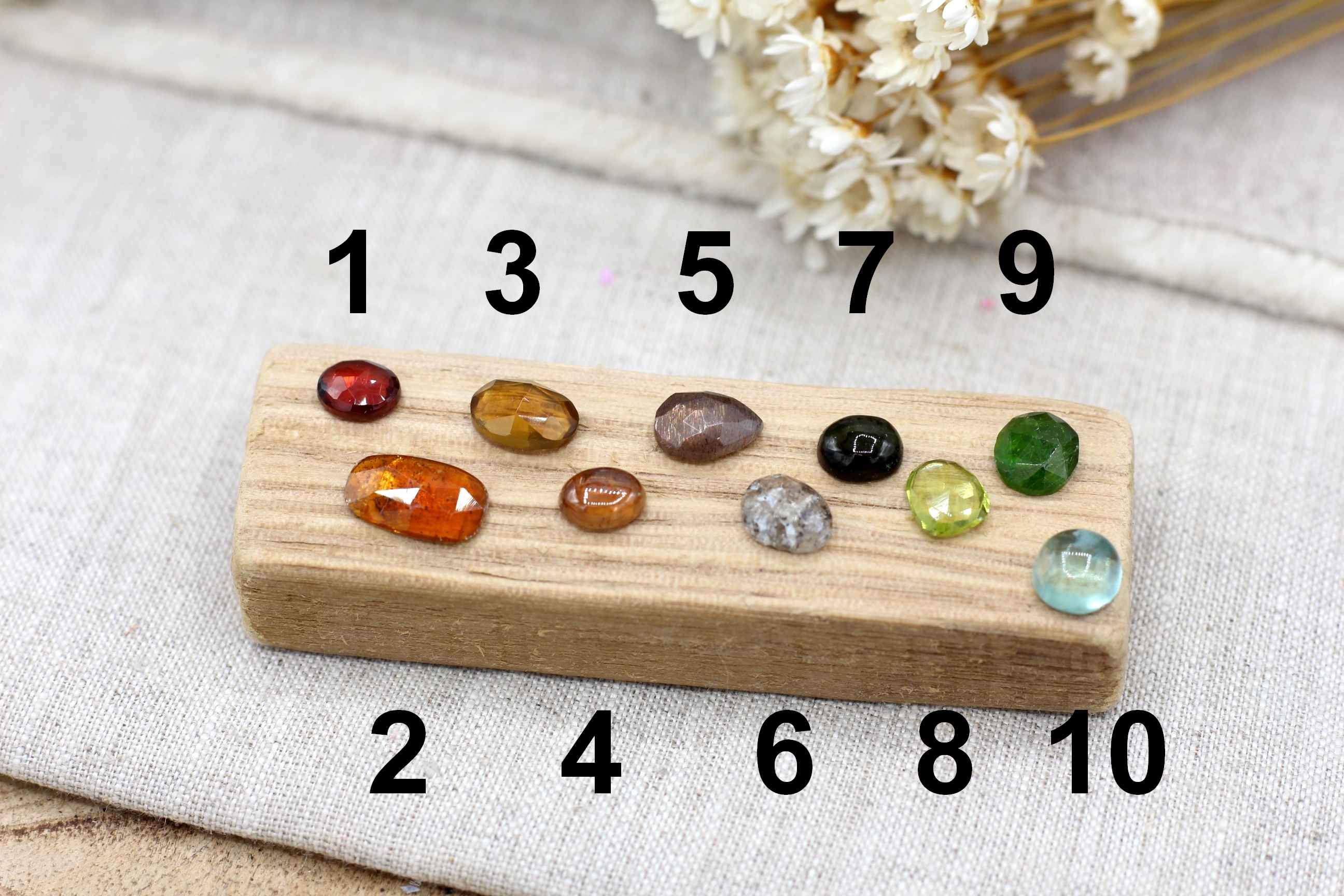 Ich habe für meine Kollektion verschiedenen Steine gesetzt, um sie gut zu zeigen. Aber wenn Stücke kombinieren möchtest und dabei eine Steinsorte magst, schmiede ich für dich. Auf dem letzten Bild siehst du eine Auswahl an Steinen, die gut zum Design passen und für alle Formen (Halskette, Ohrringe, Ringe, Armschmuck) vorhanden sind.