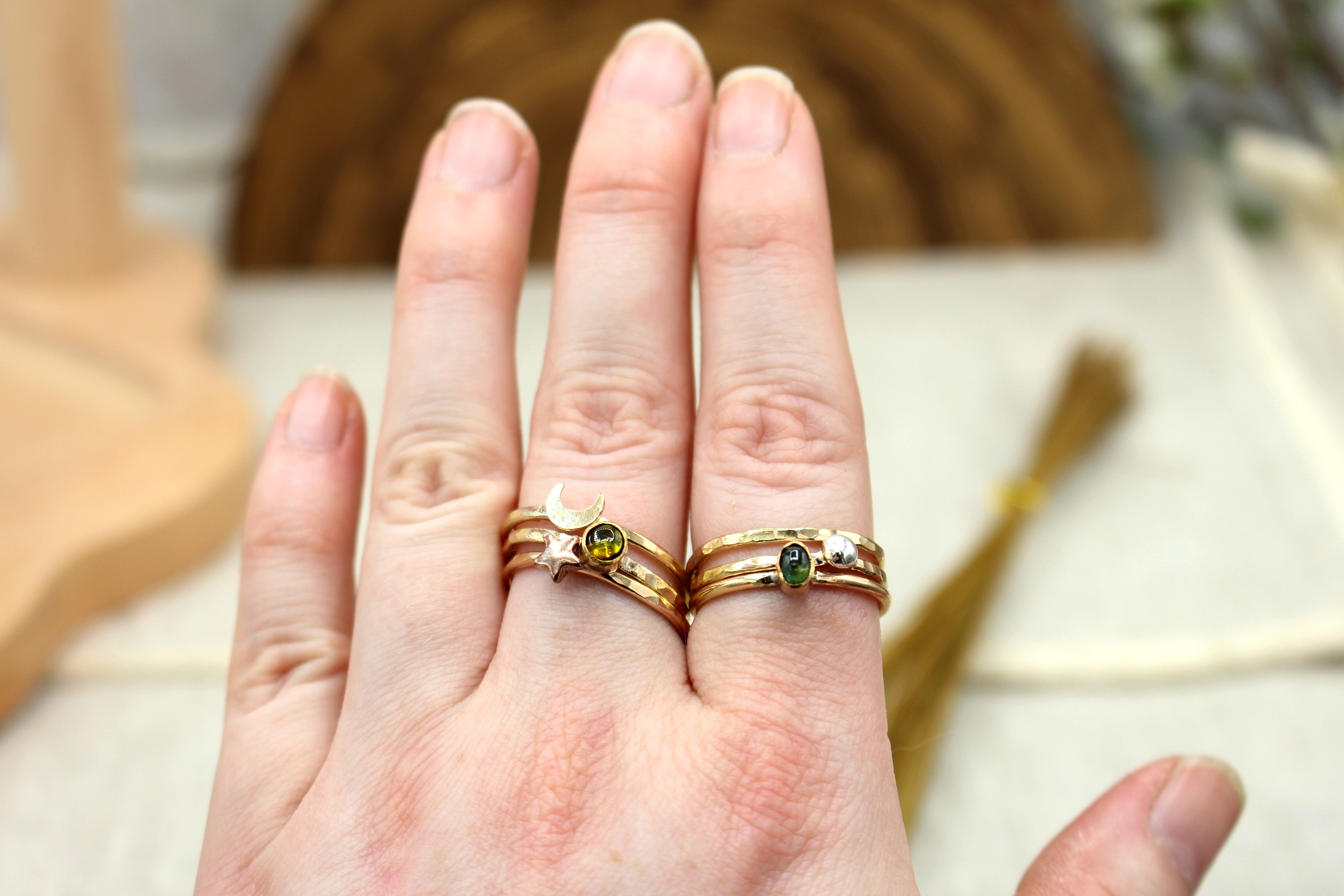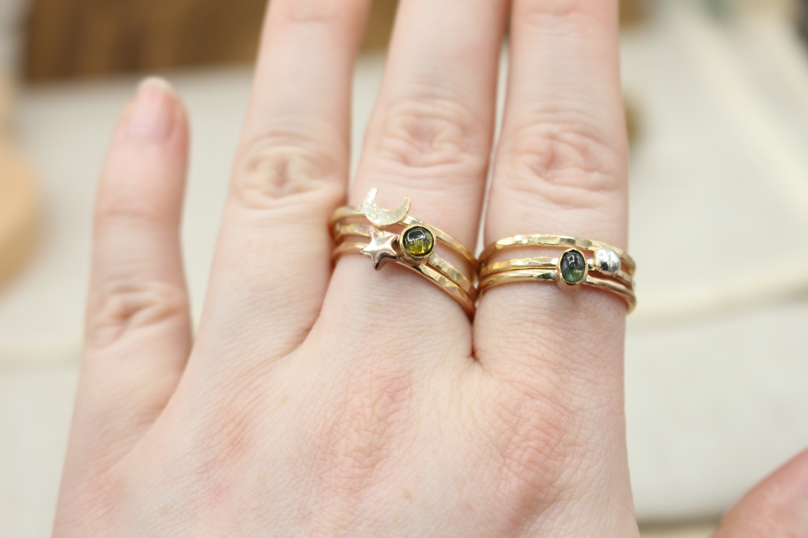 14K Gold Filled mit Gelbgold-Fillded Mond und Rosegold-Filled Stern und einem grünen Turmalin