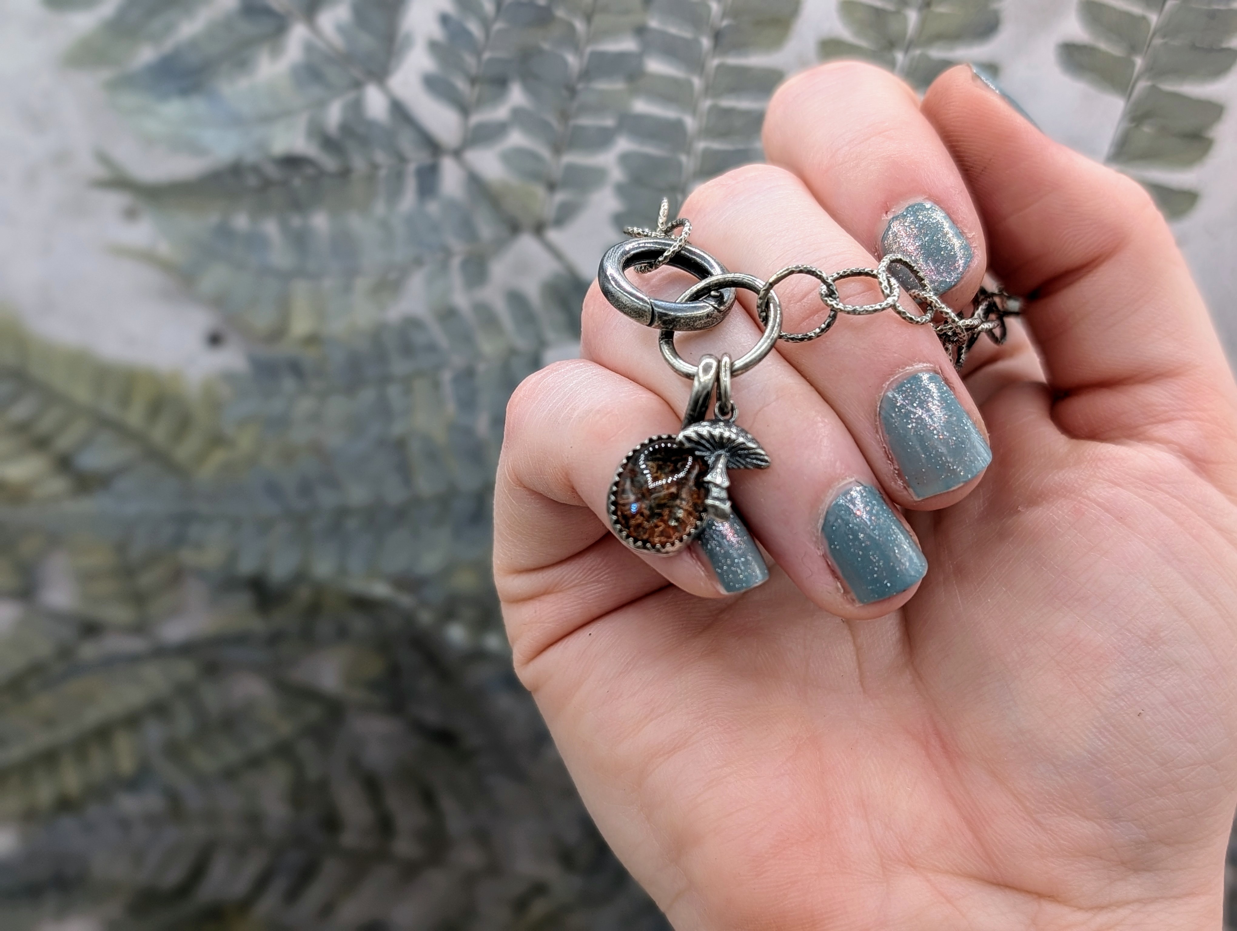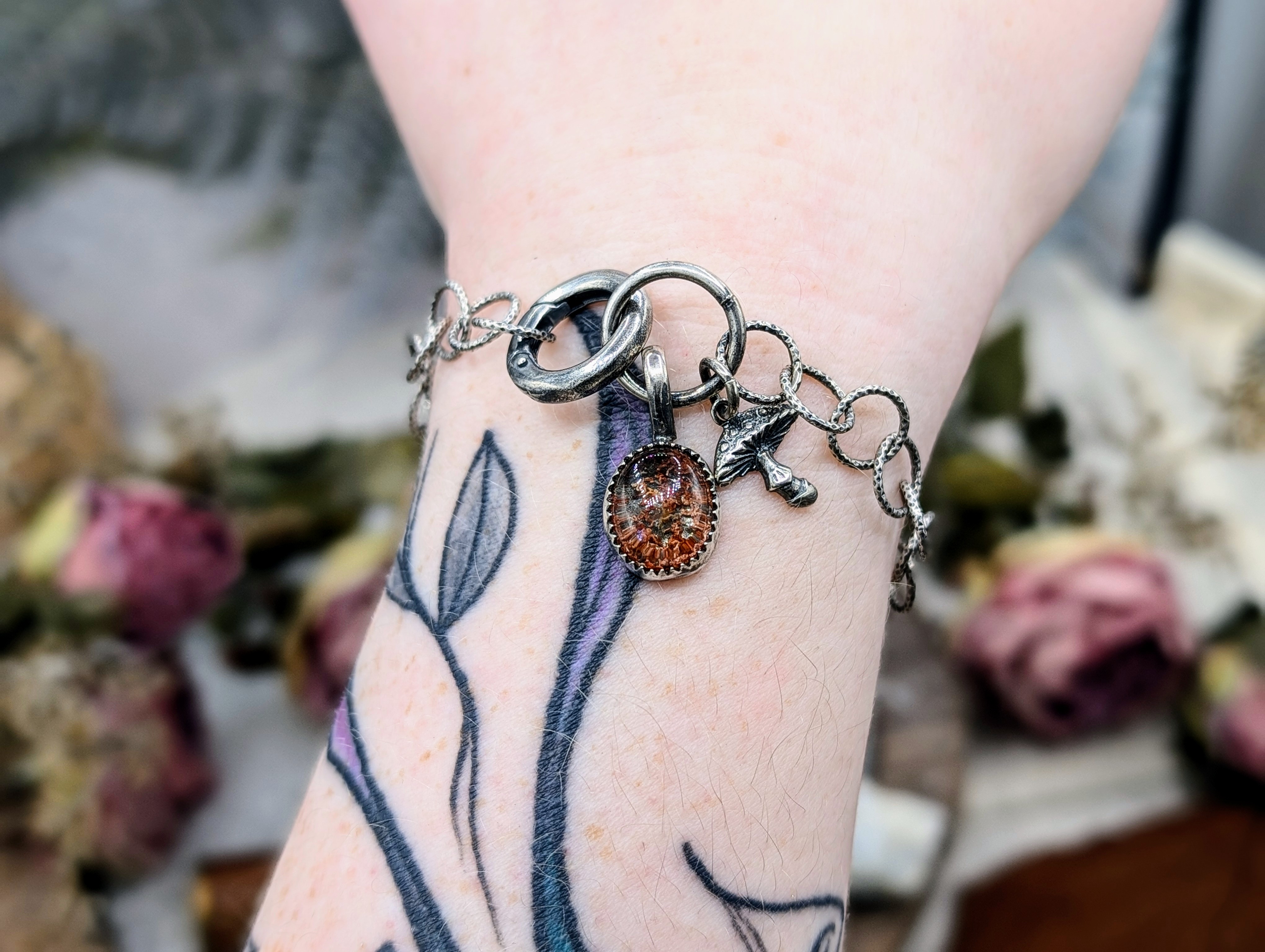 Das handgemachte Armband mit einem runden Karabiner ist 18 cm lang, lässt sich aber auch kleiner einstellen.
