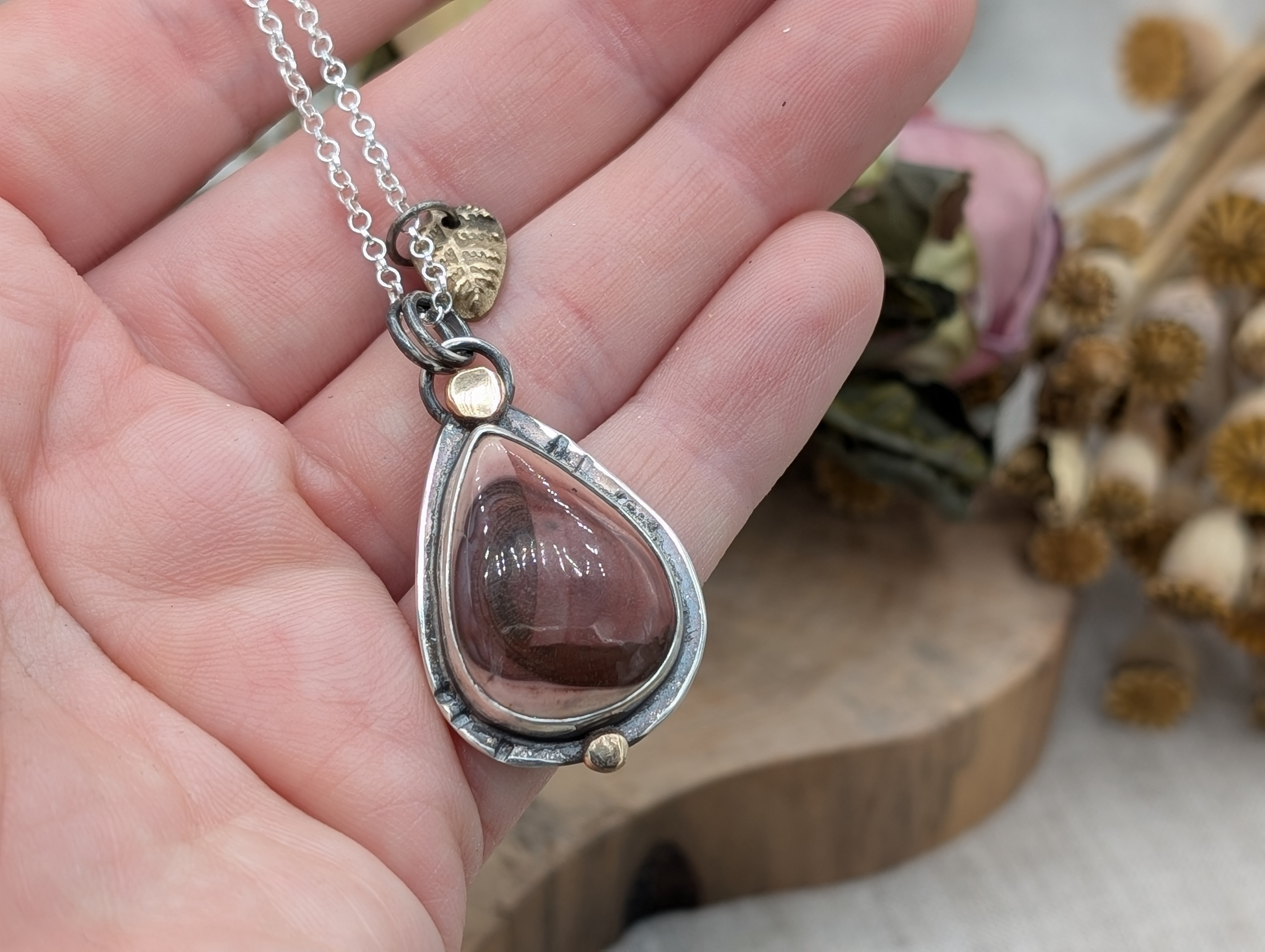 925er Sterlingsilber, Bronze, einzigartiger Ozean Jaspis aus Madagaskar, wo er nur bei Ebbe gefunden werden kann. Das kleine Farnblatt ist von mir aus Bronze gegossen. Die kleinen goldenen Punkte sind ebenfalls aus Bronze.