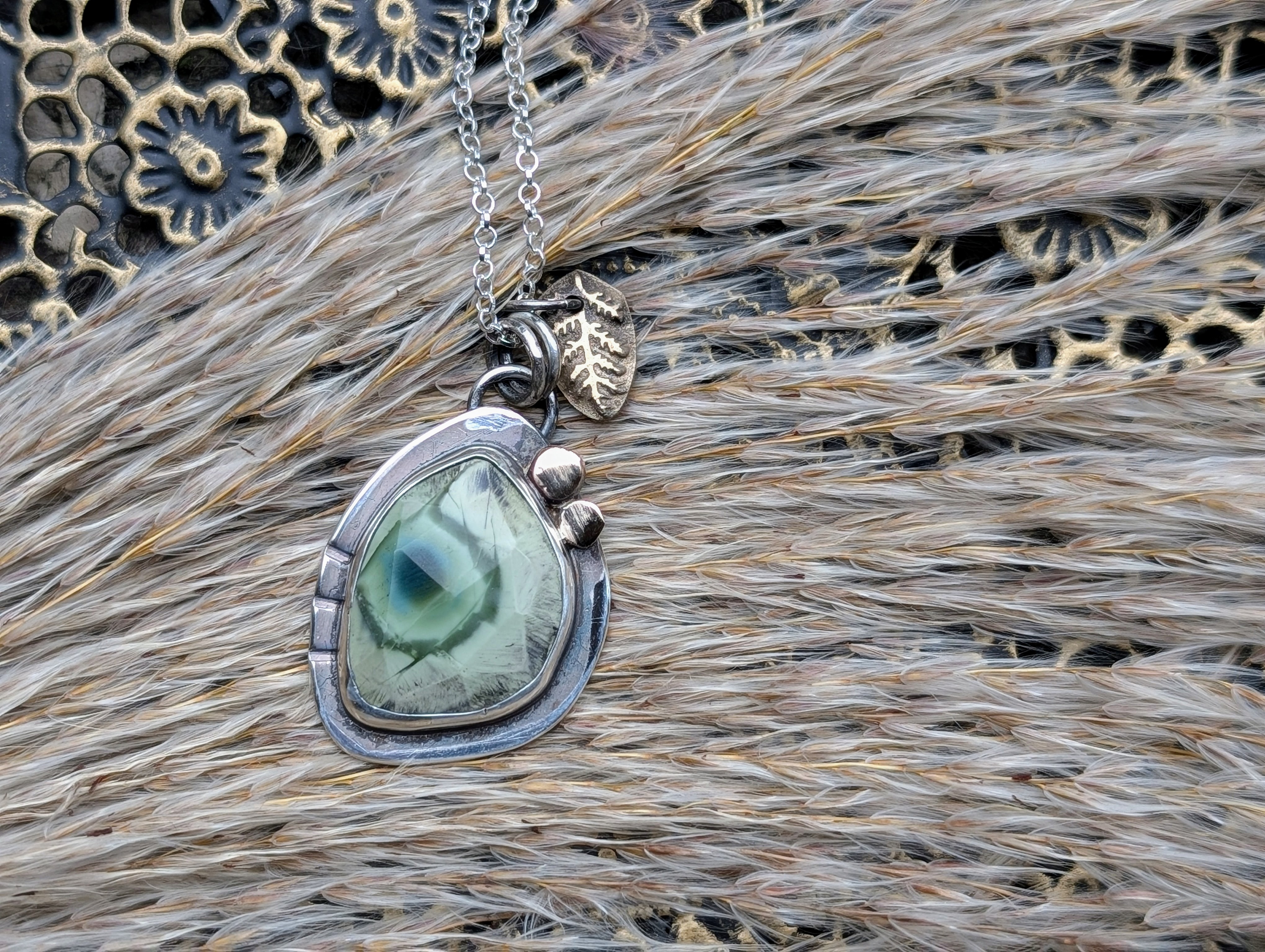 925er Sterlingsilber, Bronze, einzigartiger Ozean Jaspis aus Madagaskar, wo er nur bei Ebbe gefunden werden kann. Das kleine Farnblatt ist von mir aus Bronze gegossen. Die kleinen goldenen Punkte sind ebenfalls aus Bronze.