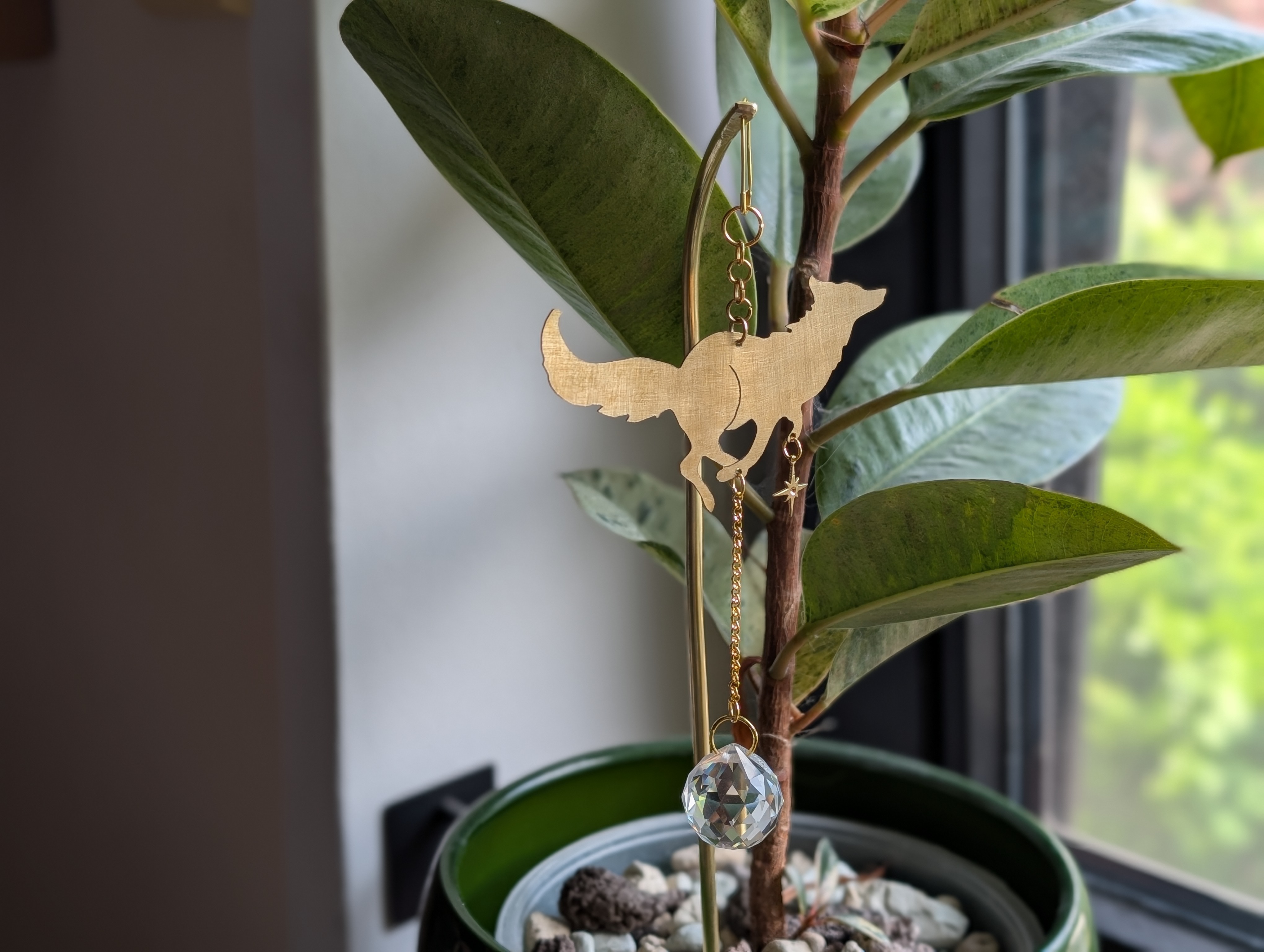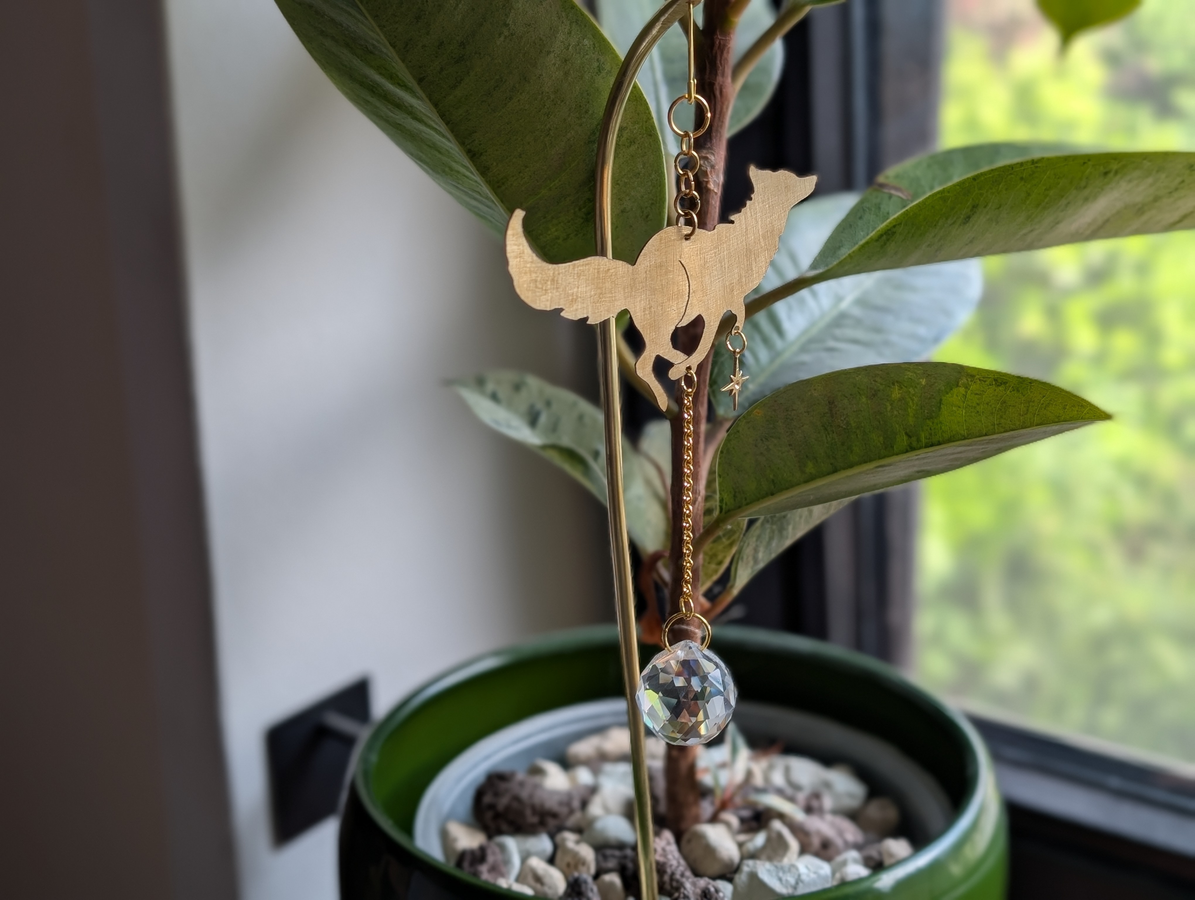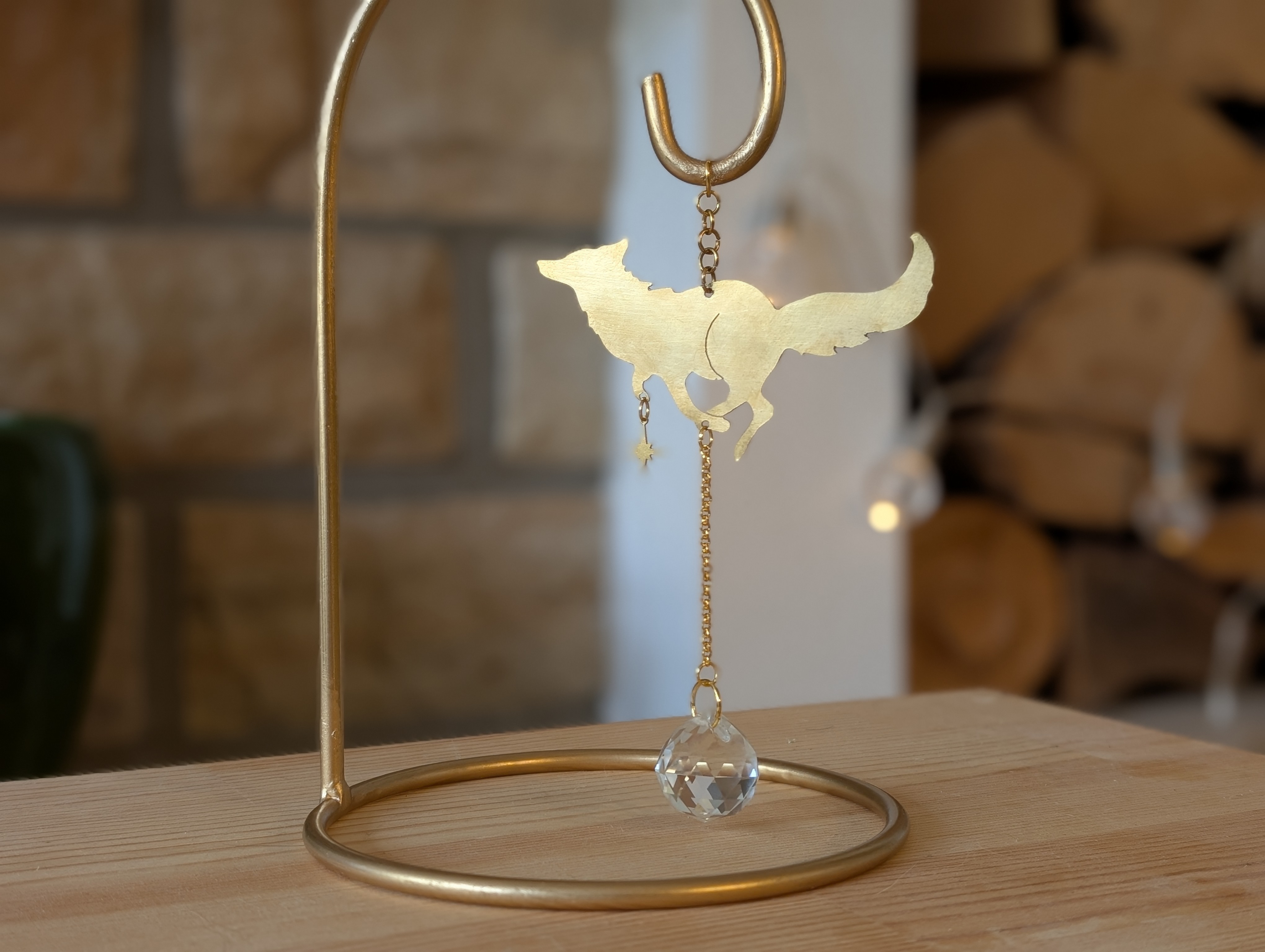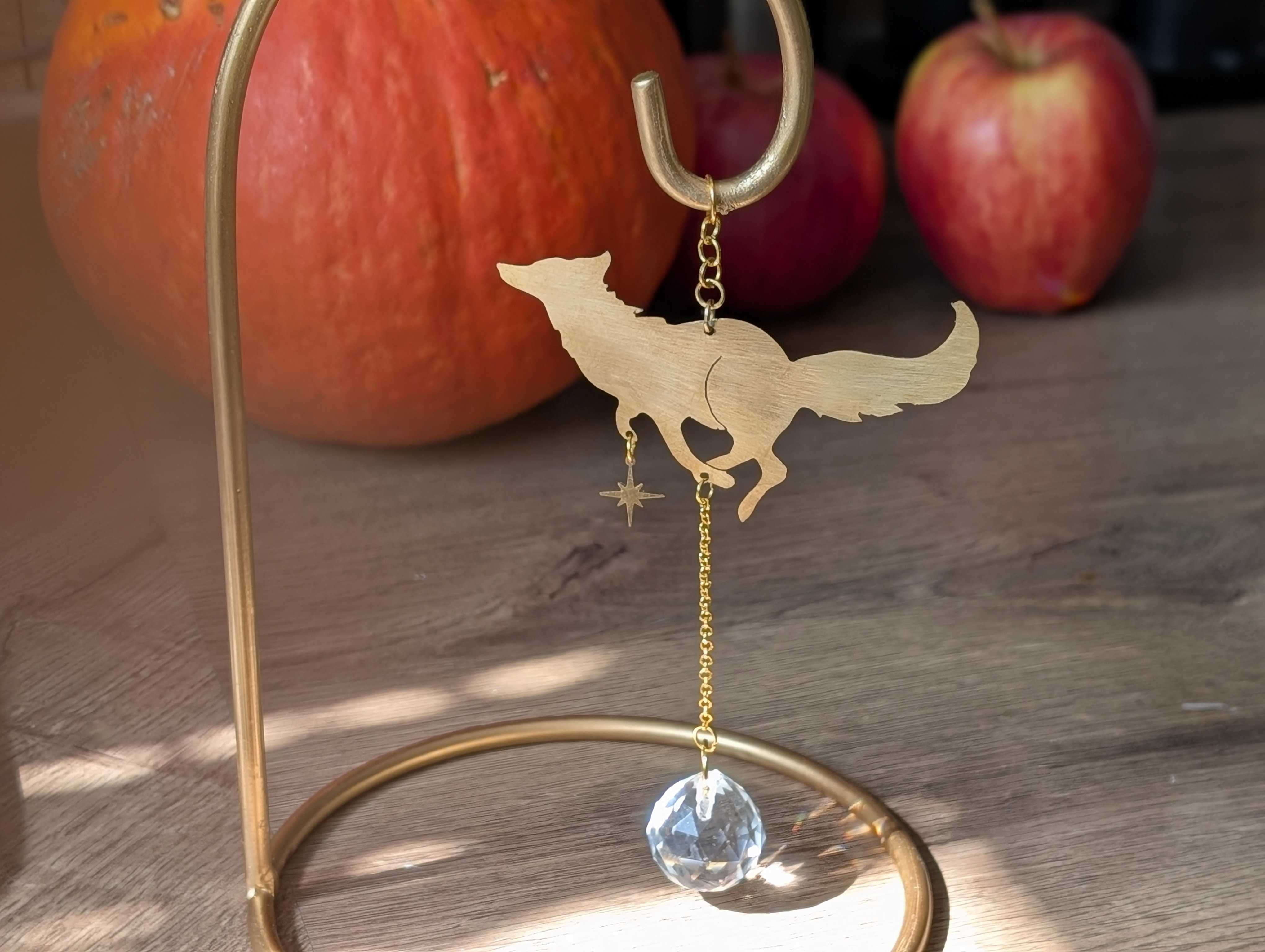 Jeder Suncatcher wird von mir sorgfältig aus Messingblech handgesägt, gebürstet, gewachst und poliert und trägt am unteren Ende eine 20 mm große Glaskugel, die das Sonnenlicht einfängt und in funkelnde Lichtpunkte verwandelt.