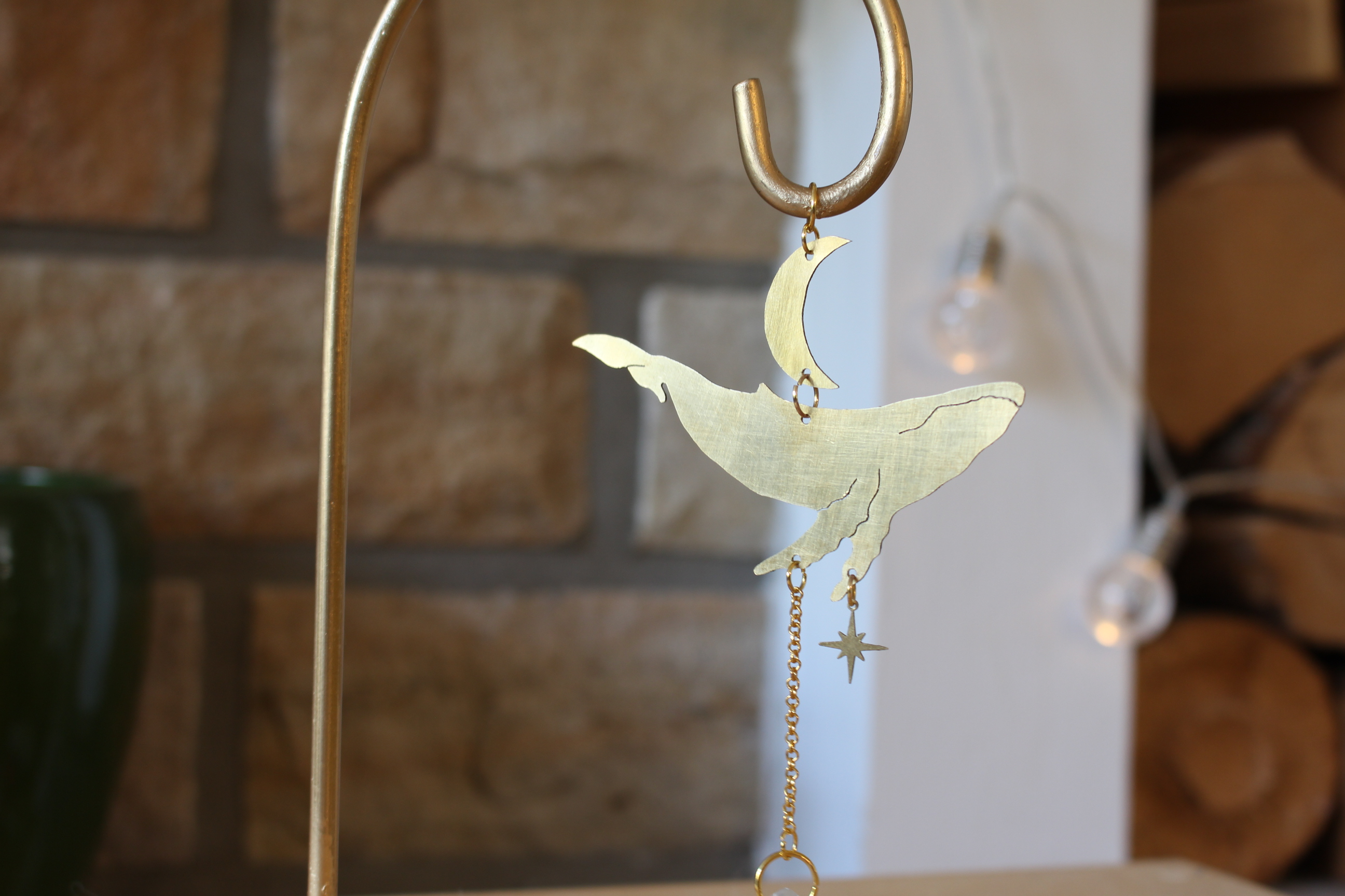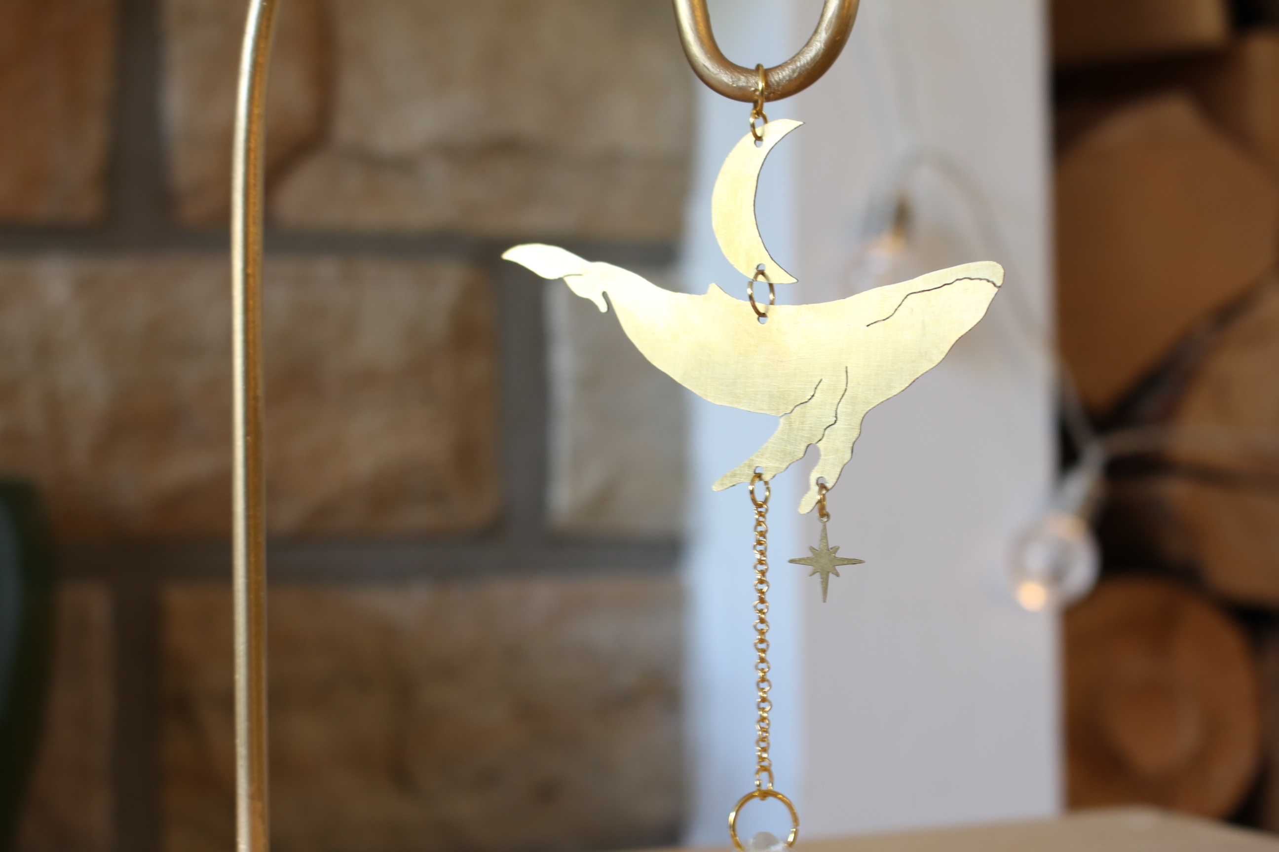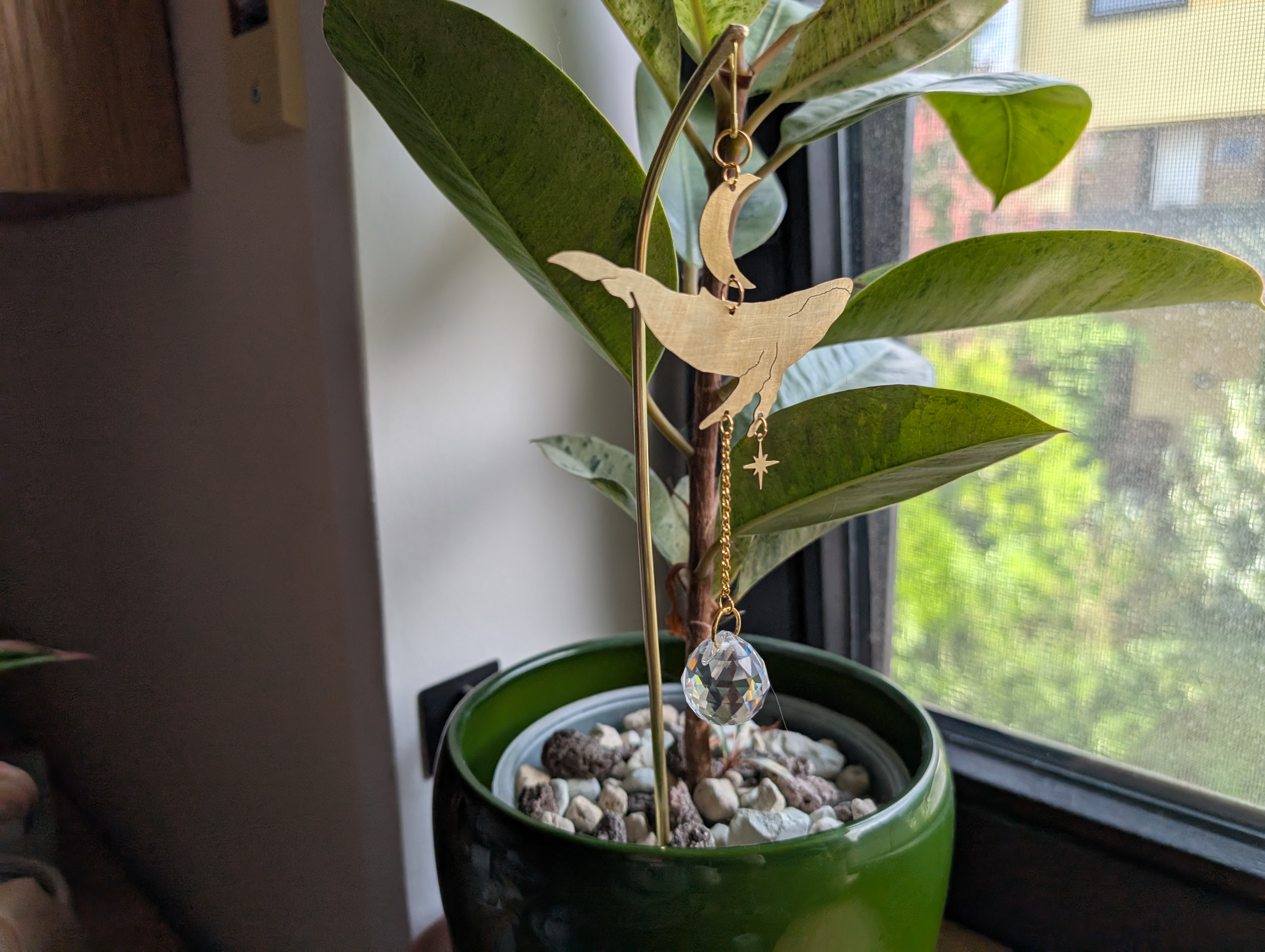 Jeder Suncatcher wird von mir sorgfältig aus Messingblech handgesägt, gebürstet, gewachst und poliert und trägt am unteren Ende eine 20 mm große Glaskugel, die das Sonnenlicht einfängt und in funkelnde Lichtpunkte verwandelt.