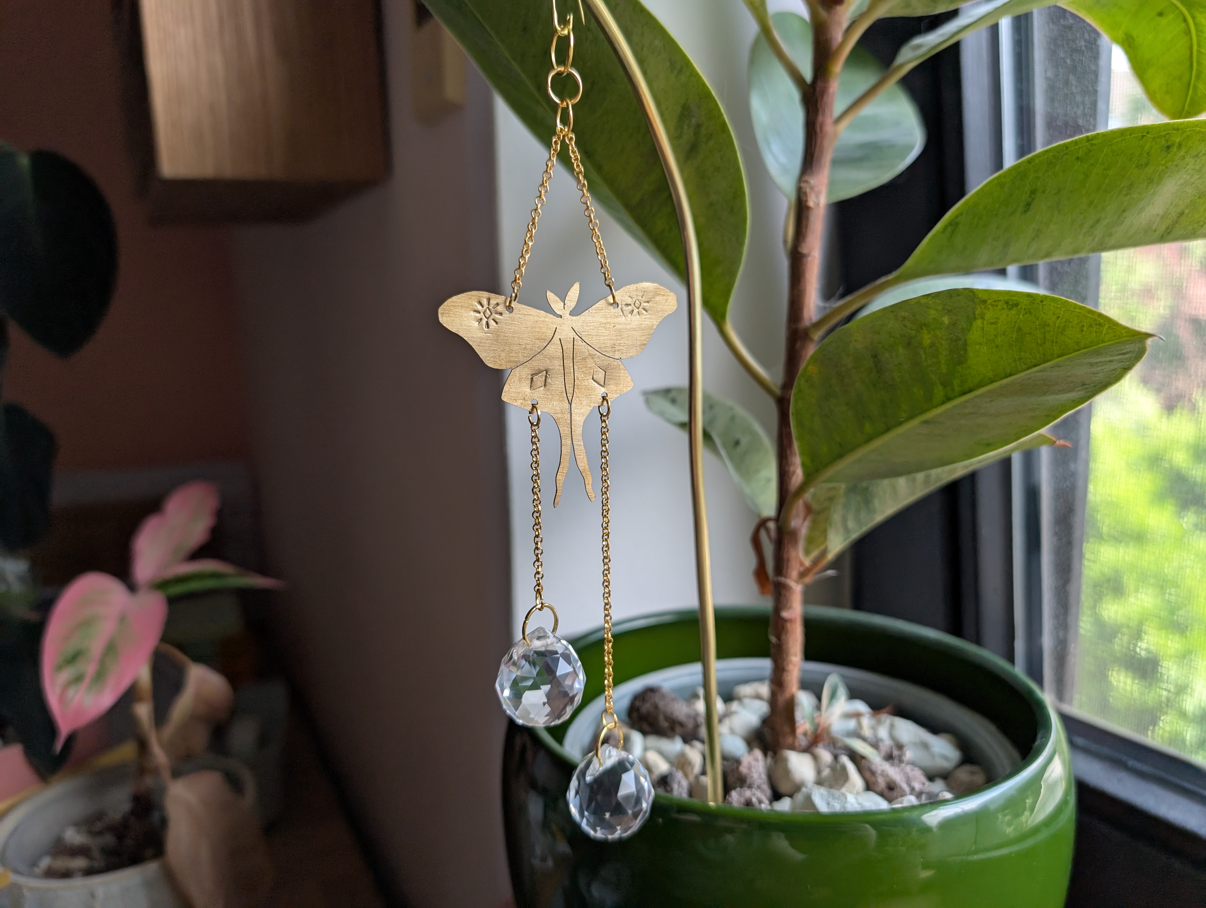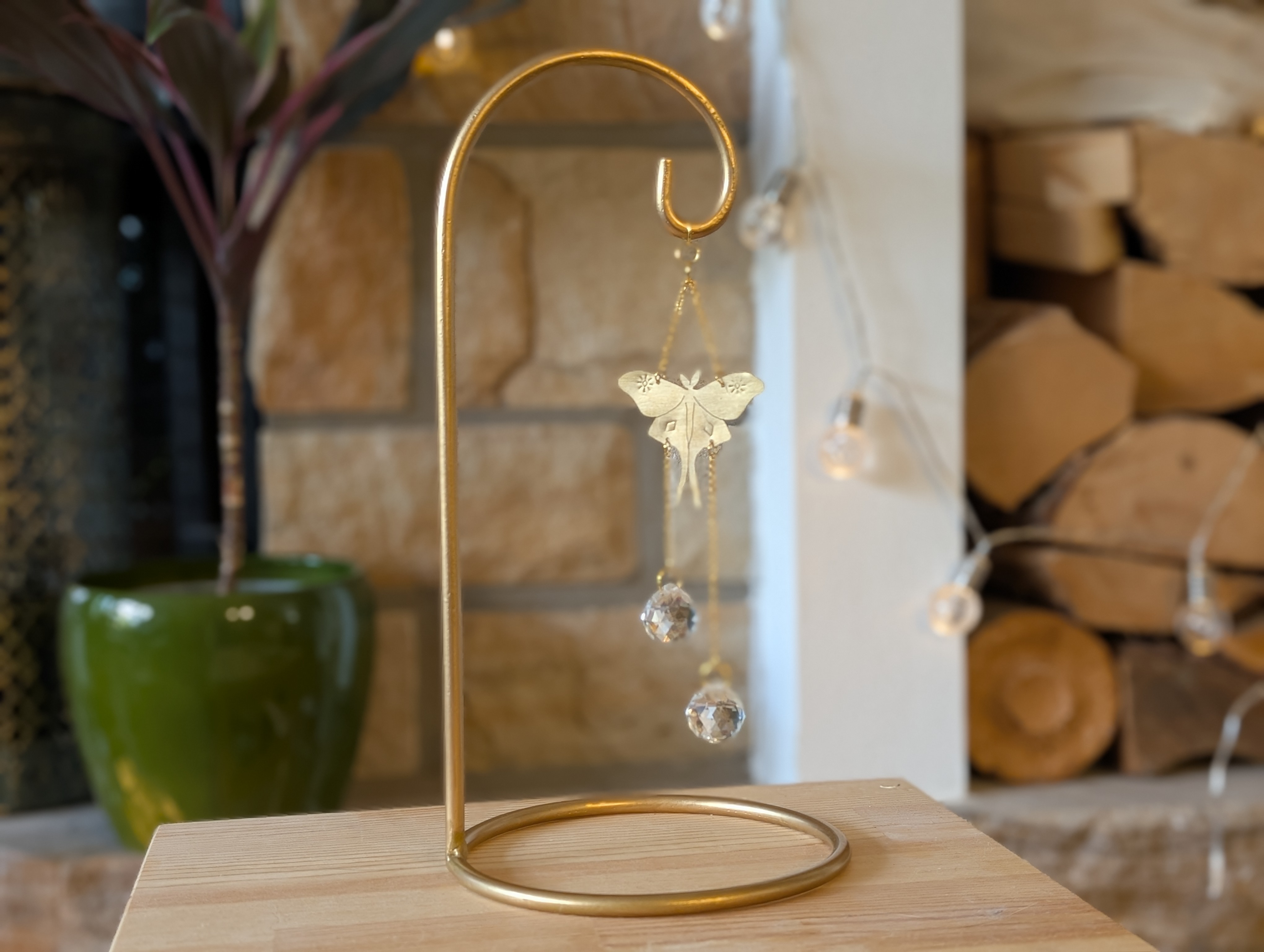 Jeder Suncatcher wird von mir sorgfältig aus Messingblech handgesägt, gebürstet, gewachst und poliert und trägt am unteren Ende eine 20 mm große Glaskugel, die das Sonnenlicht einfängt und in funkelnde Lichtpunkte verwandelt.