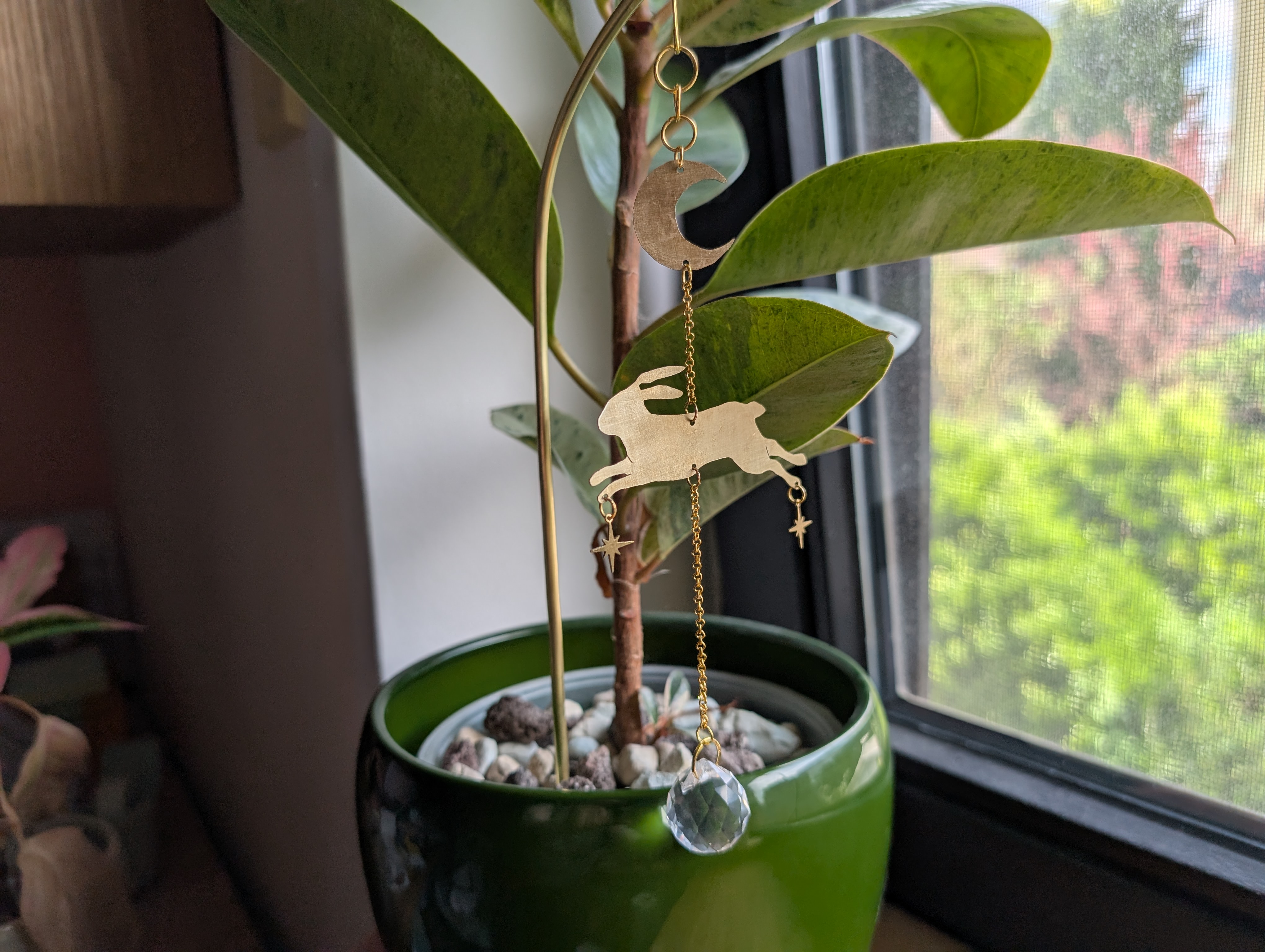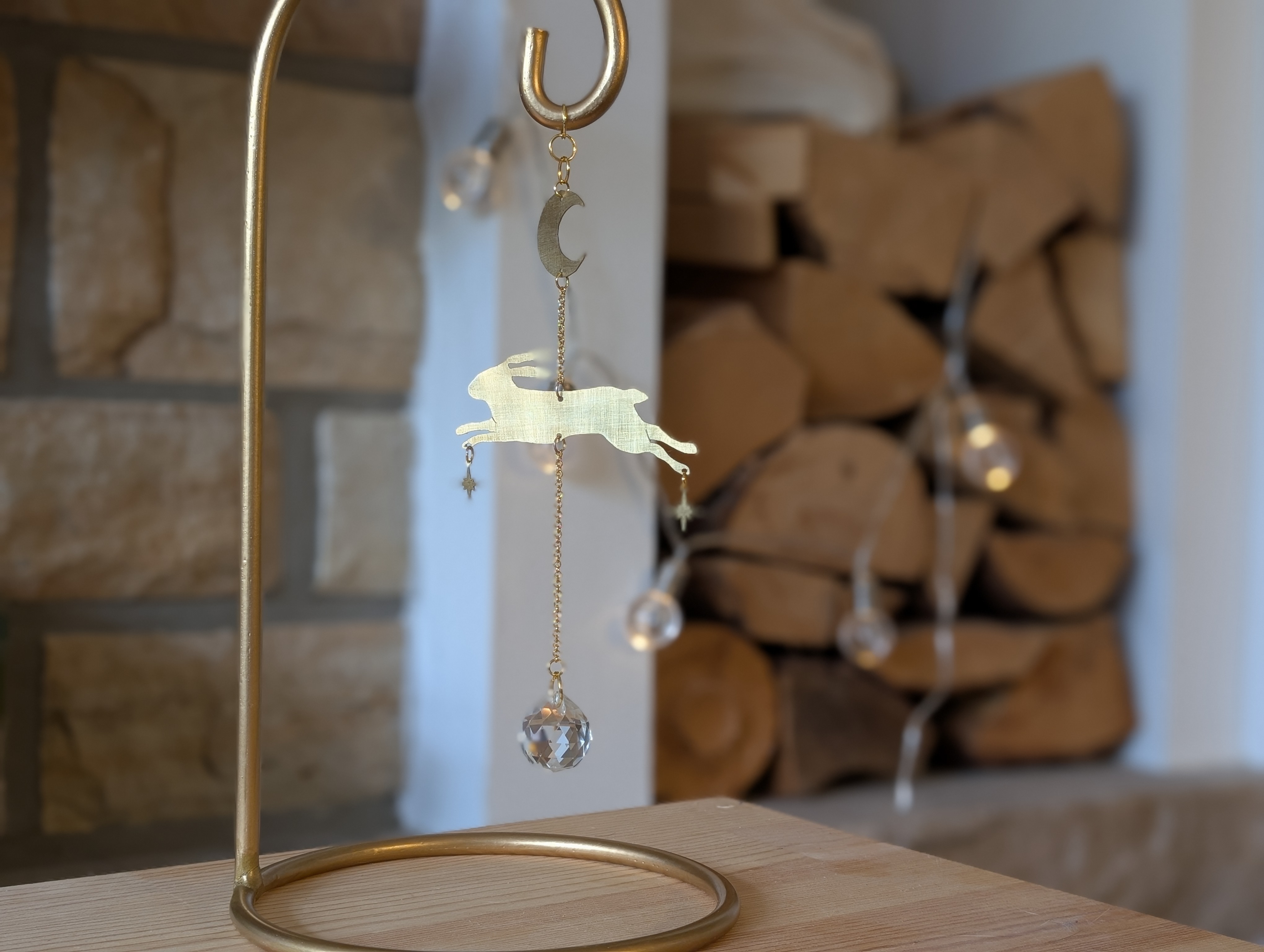 Jeder Suncatcher wird von mir sorgfältig aus Messingblech handgesägt, gebürstet, gewachst und poliert und trägt am unteren Ende eine 20 mm große Glaskugel, die das Sonnenlicht einfängt und in funkelnde Lichtpunkte verwandelt.